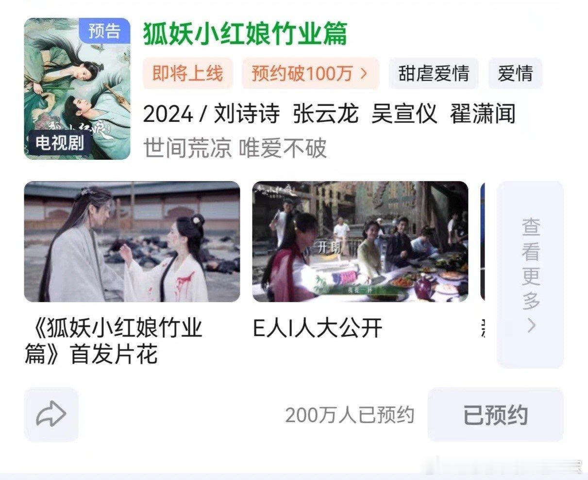 #狐妖小红娘竹业篇预约量破200万#预约突破 200 万,竹业篇值得期待!演员们的精彩表现,将为我们带来一场视觉盛宴!