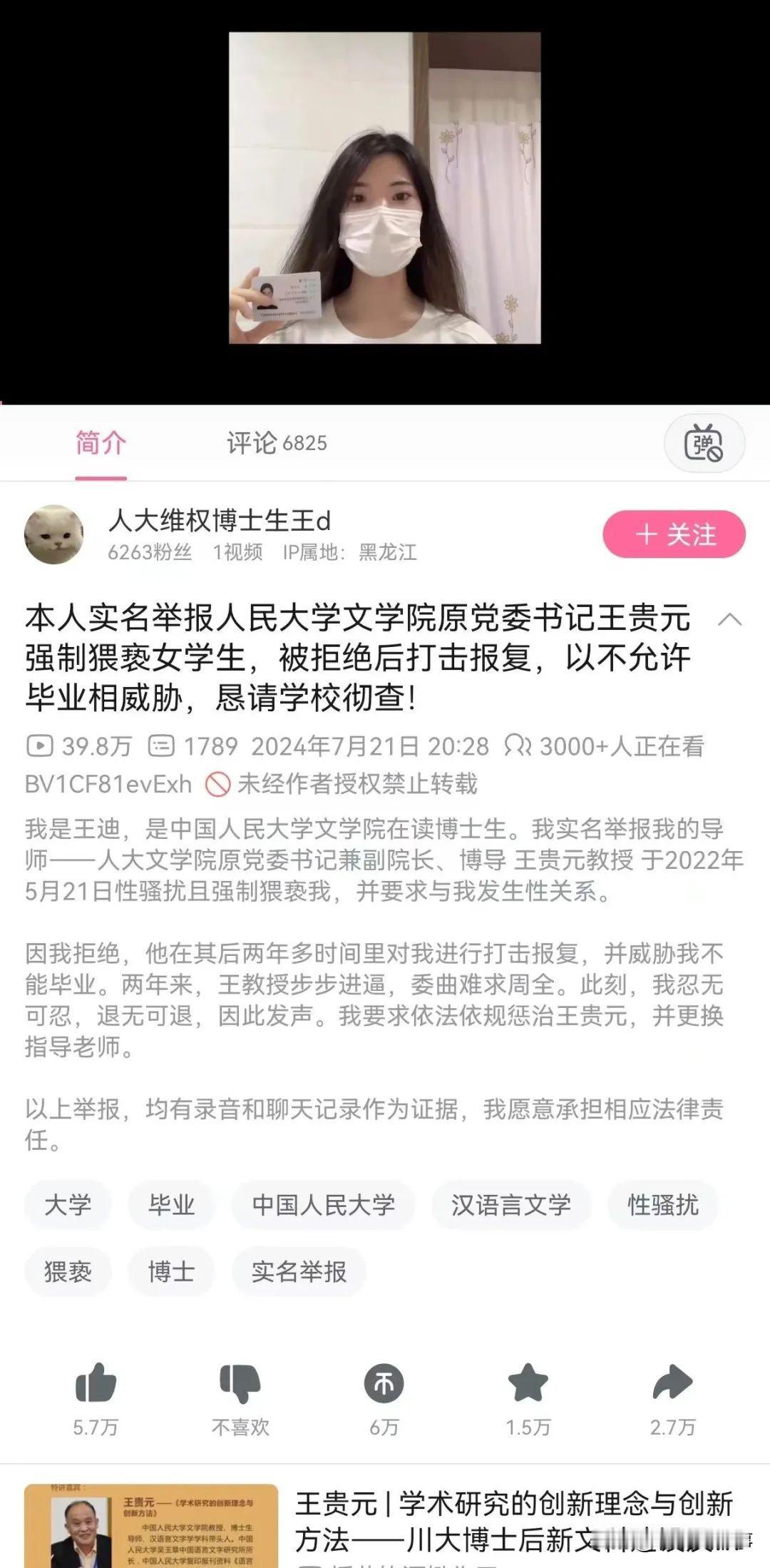 举报视频中,王迪介绍对方初次骚扰是在2022年5月21日,王贵元借口学术指导,把她叫到了办公室,当时她也没多想,就来到了办公室,万万没想到,对方跟她说的话,却和学业一点关系没有
