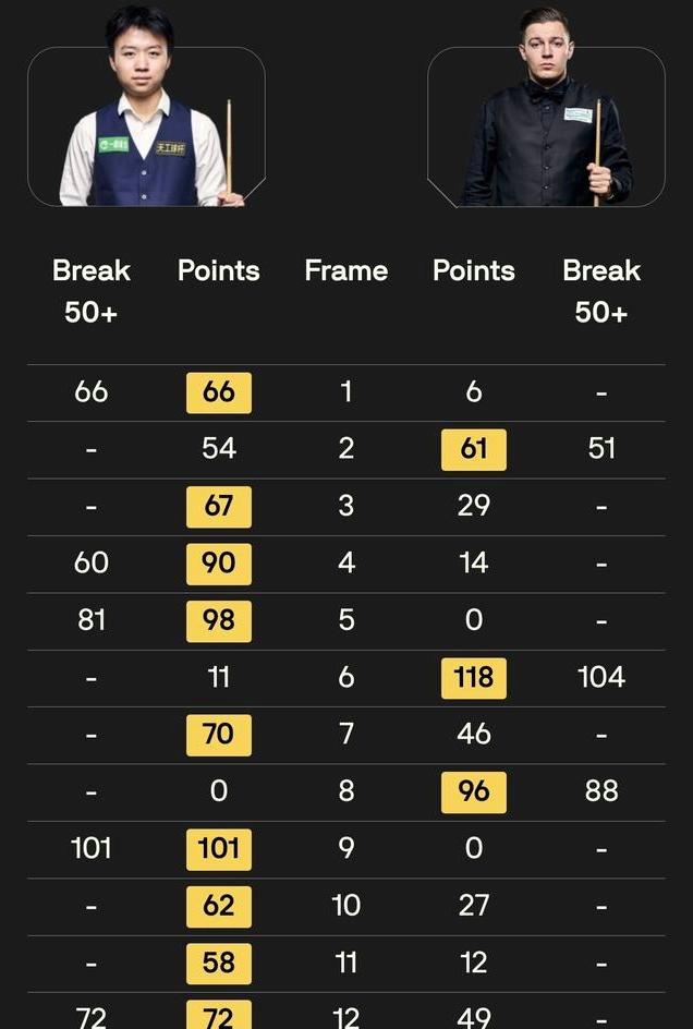 本场比赛最大的看点莫过于双方火力全开的高分对决。在长达数小时的较量中,江俊犹如一台得分机器,整场比赛轰出了一杆破百和五杆50+的华丽数据。他的单杆101分展现了他连续得分的能力,而五杆50+(66分、60分、81分、72分、70分)则充分证明了他在中局缠斗中的绝对把握性。这五杆高分分布均匀,说明江俊的状态并非昙花一现,而是贯穿了整场比赛的始终。