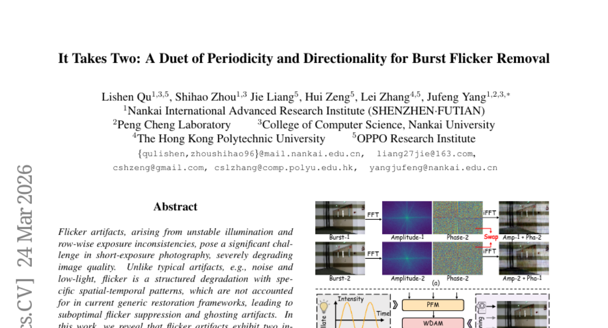 当我们在室内用手机拍照时,经常会发现照片上莫名其妙地出现了一道道明暗相间的条纹,就像老电视机信号不好时出现的横纹一样。这种现象被称为"闪烁伪影",它的出现让许多原本精美的照片变得面目全非。最近,来自南开大学国际先进研究院(深圳·福田)、南开大学计算机学院、香港理工大学以及OPPO研究院的联合研究团队,为这个困扰摄影爱好者已久的问题提出了一个创新解决方案。这项研究成果已于2026年3月发表在计算机视觉顶级会议论文集中,论文编号为arXiv:2603.22794v1。