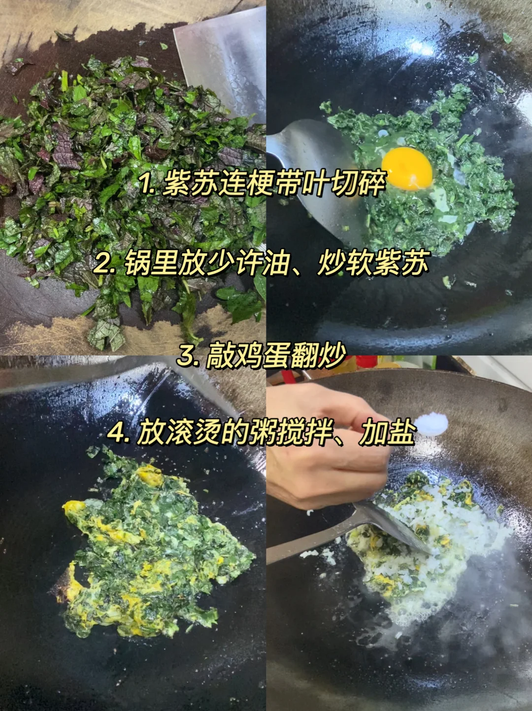 👩🍳做法:紫苏连梗带叶,切碎;锅里倒少许油,把紫苏炒软,然后再敲一个鸡蛋下去,翻炒一下,倒两勺熬好的白粥,搅拌一下,放少许盐,出锅。