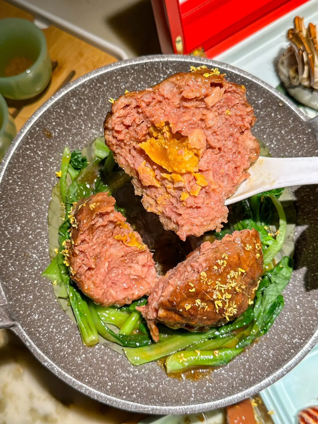 不愧是招牌淮扬菜呀,狮子头圆润饱满,吃起来口感很嫩,里面还加了马蹄和咸蛋黄,口感非常丰富