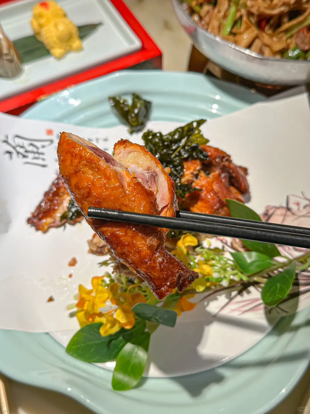 烤鸡鲜嫩多汁,带着桂花香气,还有淡淡的茶香,口感真的蛮清爽的,蘸着干碟吃口感更丰富