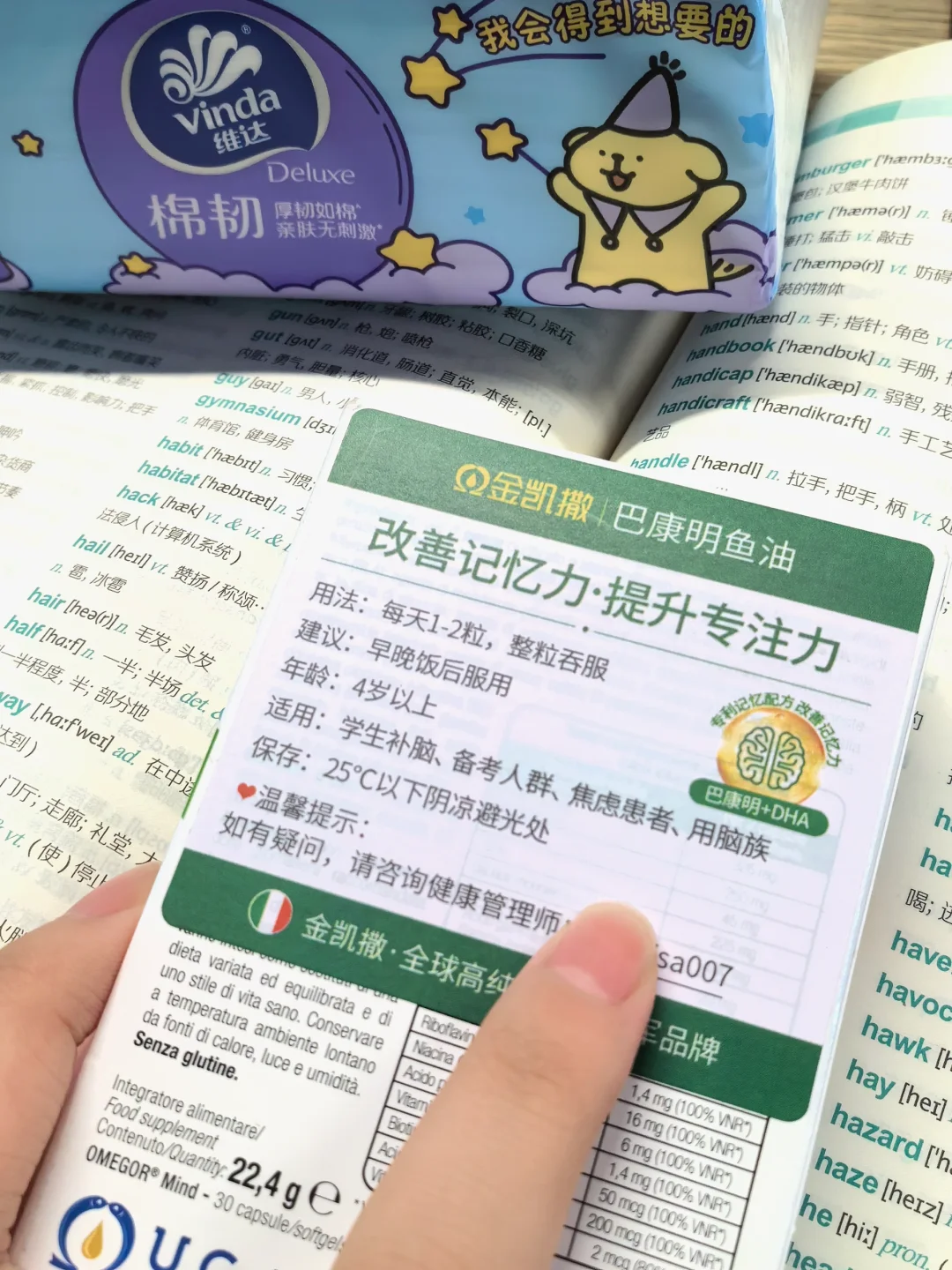 ✔️背书弯道超车,可以试试看巴康明🐟油,在伊能静直播间买的,嘎嘎好用,DHA+假马齿苋+维生素B+锌的配方很适合备考学习,假马齿苋提取物特别好吸收,因为我之前吃的单一DHA鱼油感觉不是很耐受,这个里面有草本植物可以作为缓冲并且提升注意力,感觉自己确实状态有变好,客服说假马齿苋提取物的吸收率是DHA的四倍,不知道尊嘟假嘟,然后这个里面的维生素和锌,确实很好补,帮助改善免疫机能,考研后期维稳很不错🥰