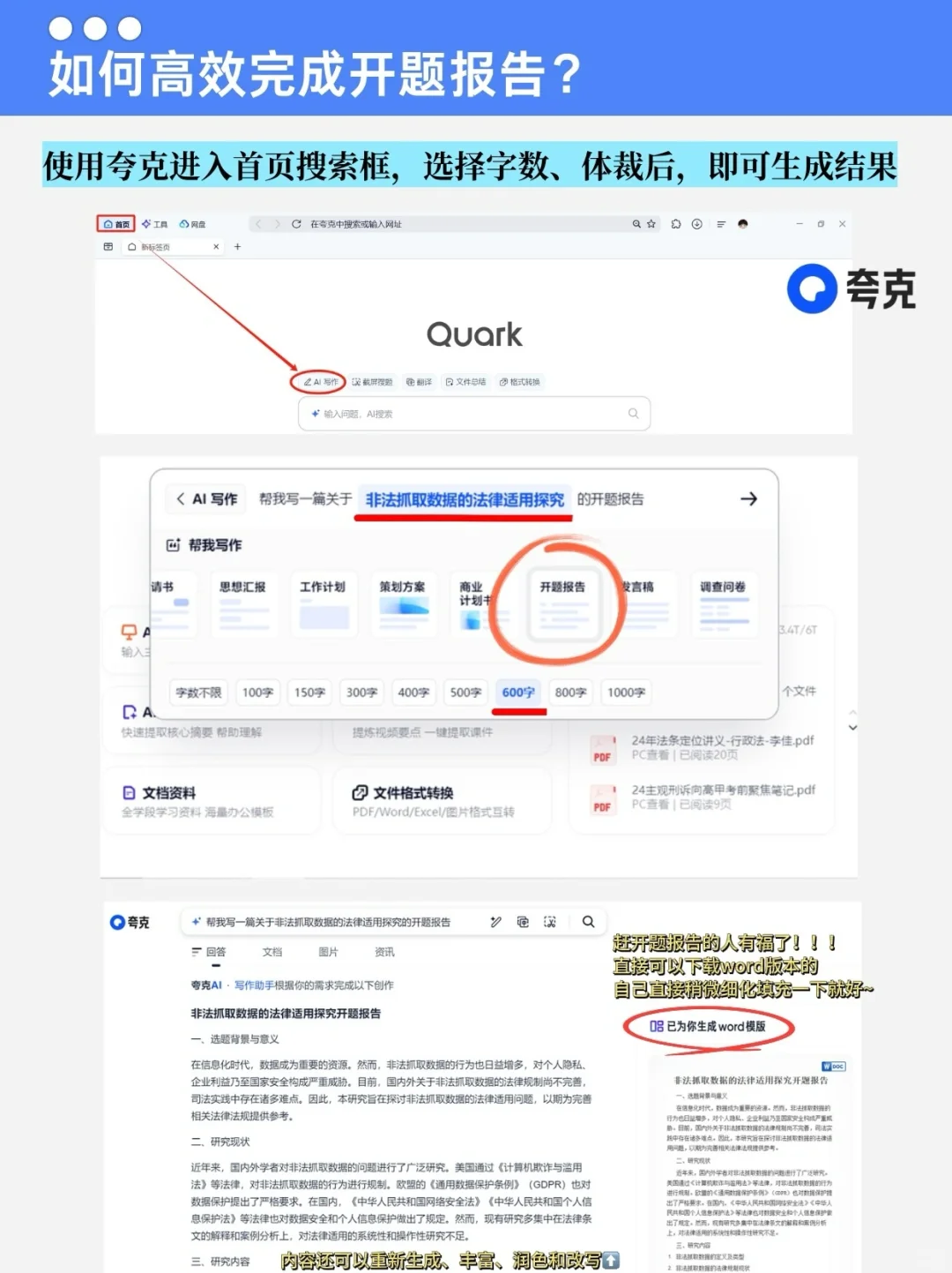 使用夸克进入搜索框,点击AI写作,选择字数、体裁-开题报告后,即可生成!还能直接下载word版本,再稍微细化填充下就能搞定