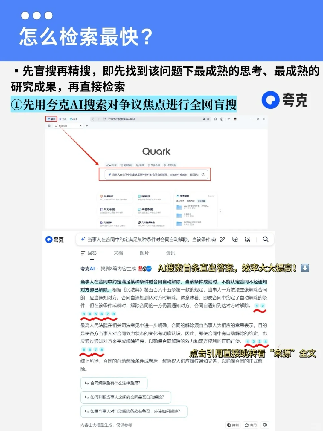 ①先用夸克AI搜索对争议焦点进行全网盲搜,首条直出答案,省时省力!