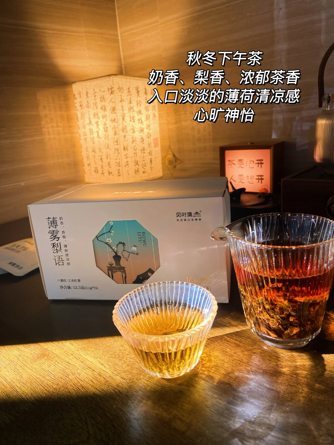 👉爱喝茶的老茶客给我安利了一款 [薄雾梨语],在我初次喝到它时就尤为喜欢,干茶是淡淡奶香,入口却是梨子甘甜🍐,浓郁的茶香之余,还有淡淡的薄荷清凉感,恰似秋风拂面,让人心旷神怡。