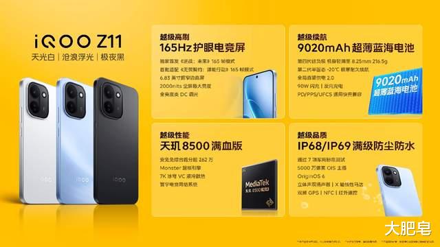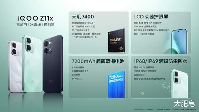 同场亮相的 iQOO Z11x,精准瞄准 LCD 屏用户与长续航刚需群体,搭载 7200mAh 蓝海电池、120Hz LCD 莱茵护眼屏,同时保留了 IP68/IP69 防尘防水、全功能 NFC 等实用配置,在入门中端市场形成了差异化竞争力。