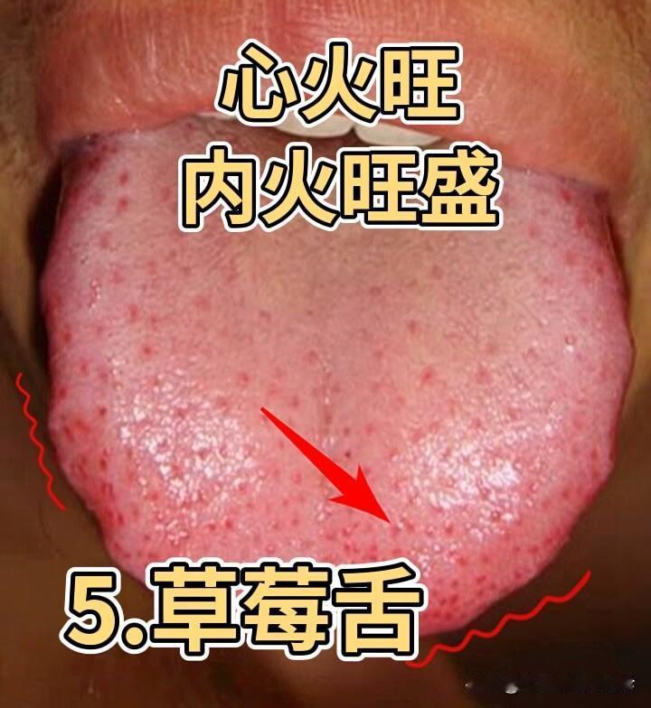 舌象:舌头增大发红,舌上还有很多小红点,像草莓一样