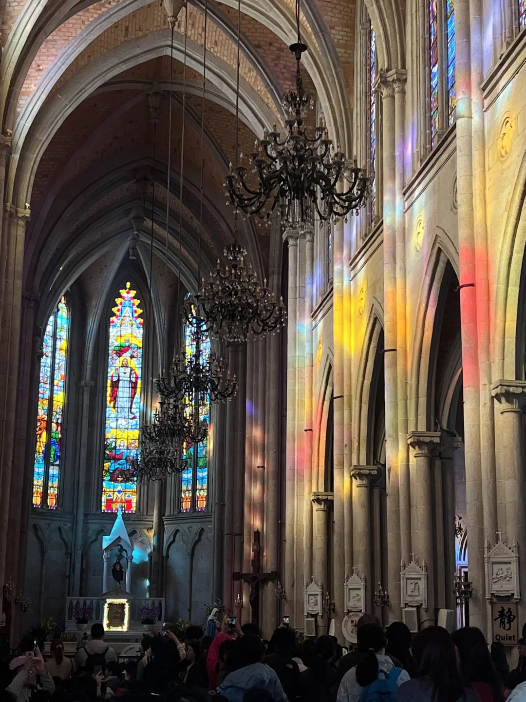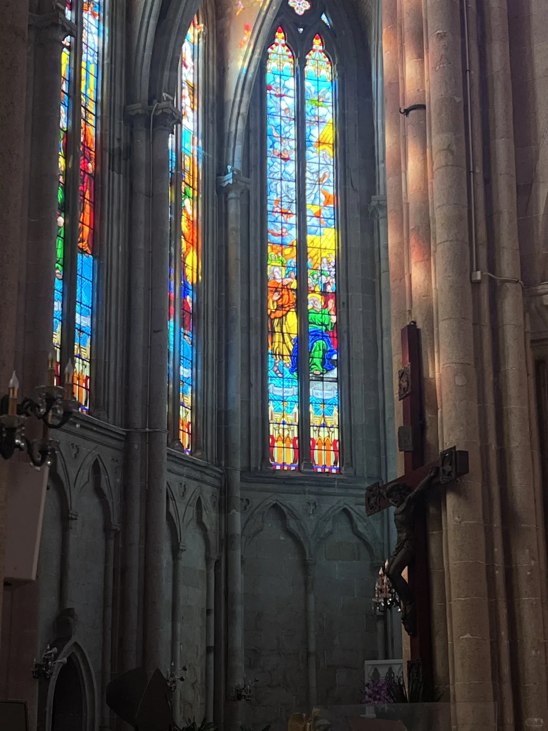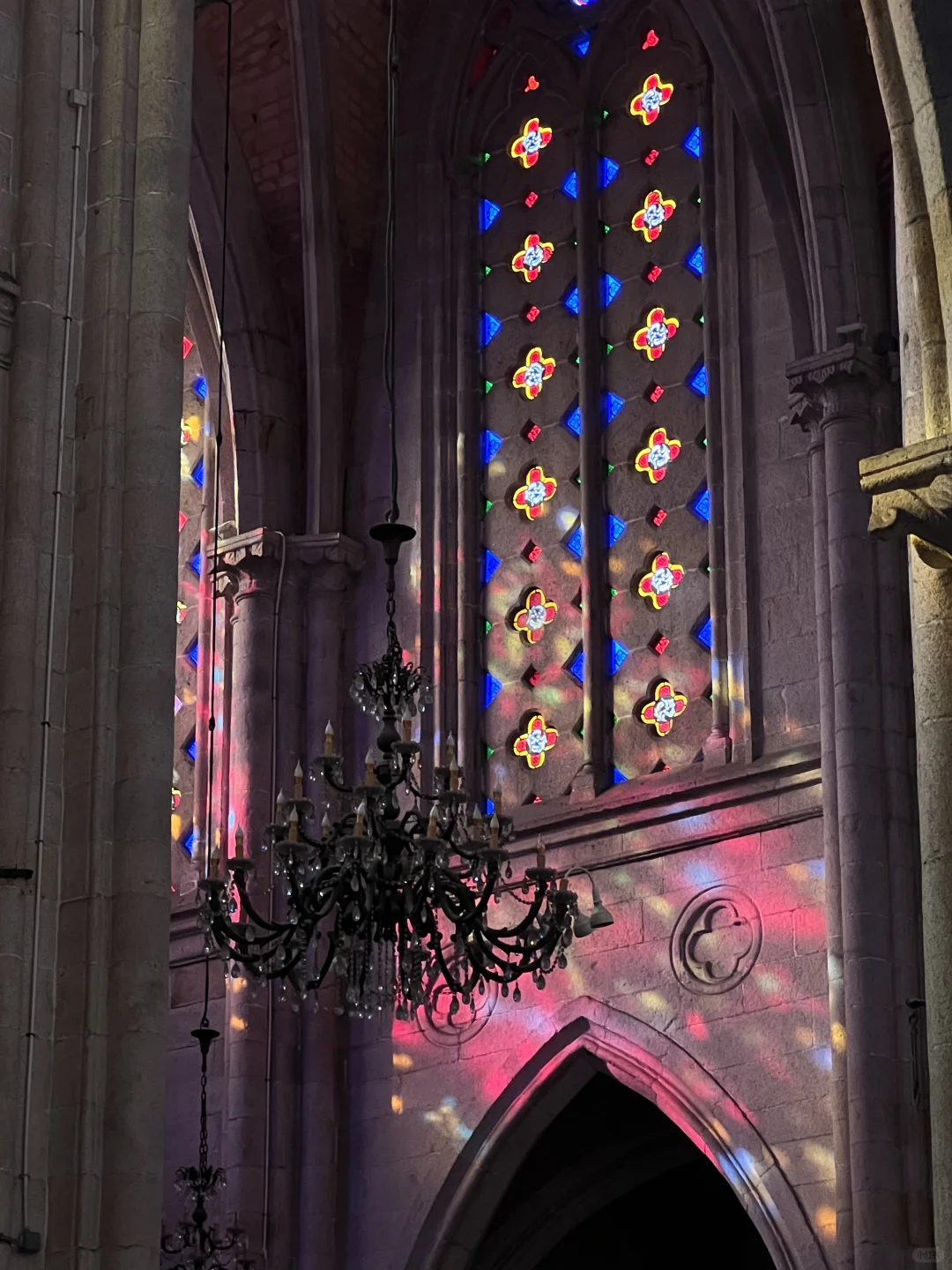 玻璃彩窗映射在柱子上灿烂的光斑让人心花怒放
