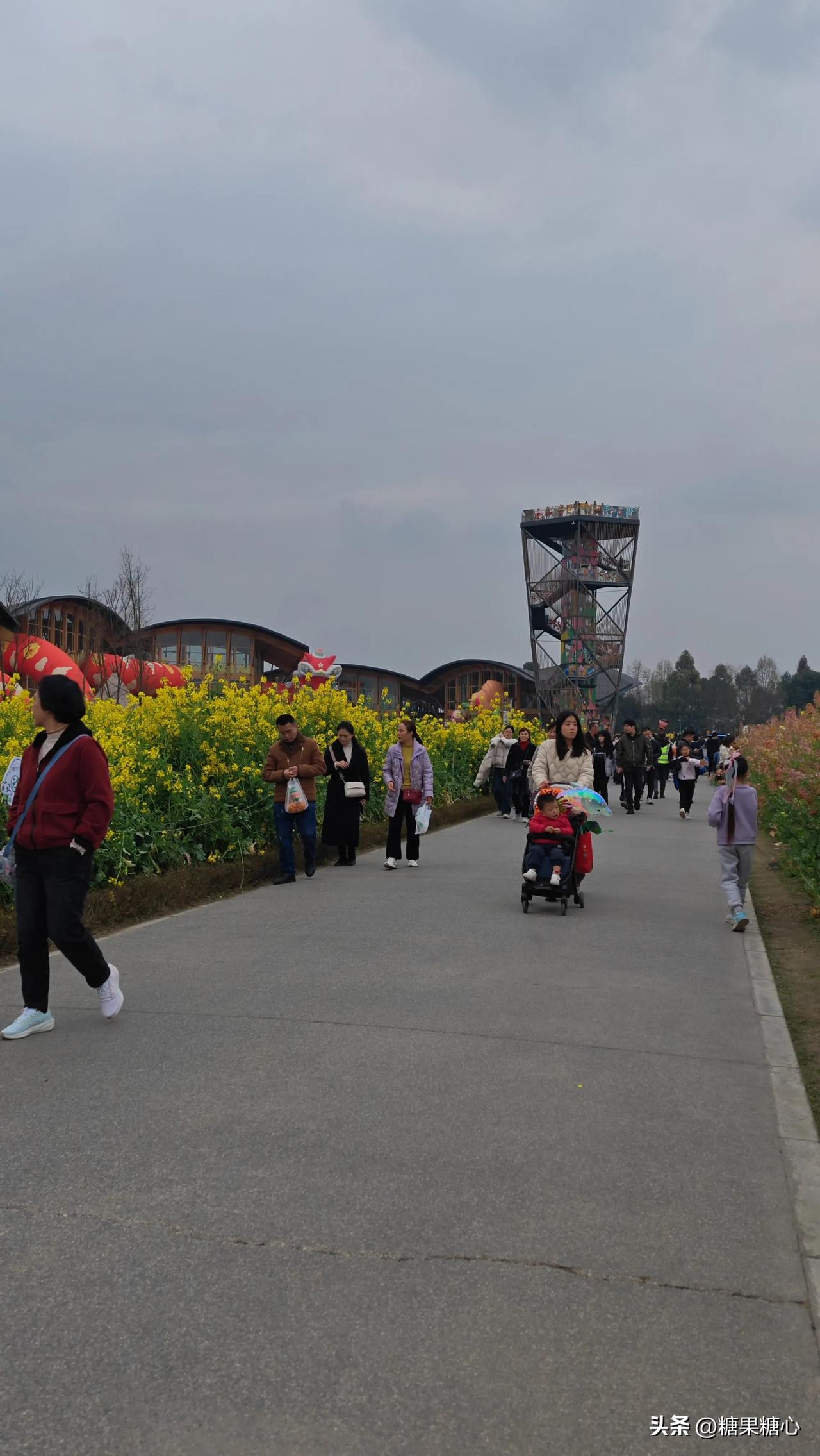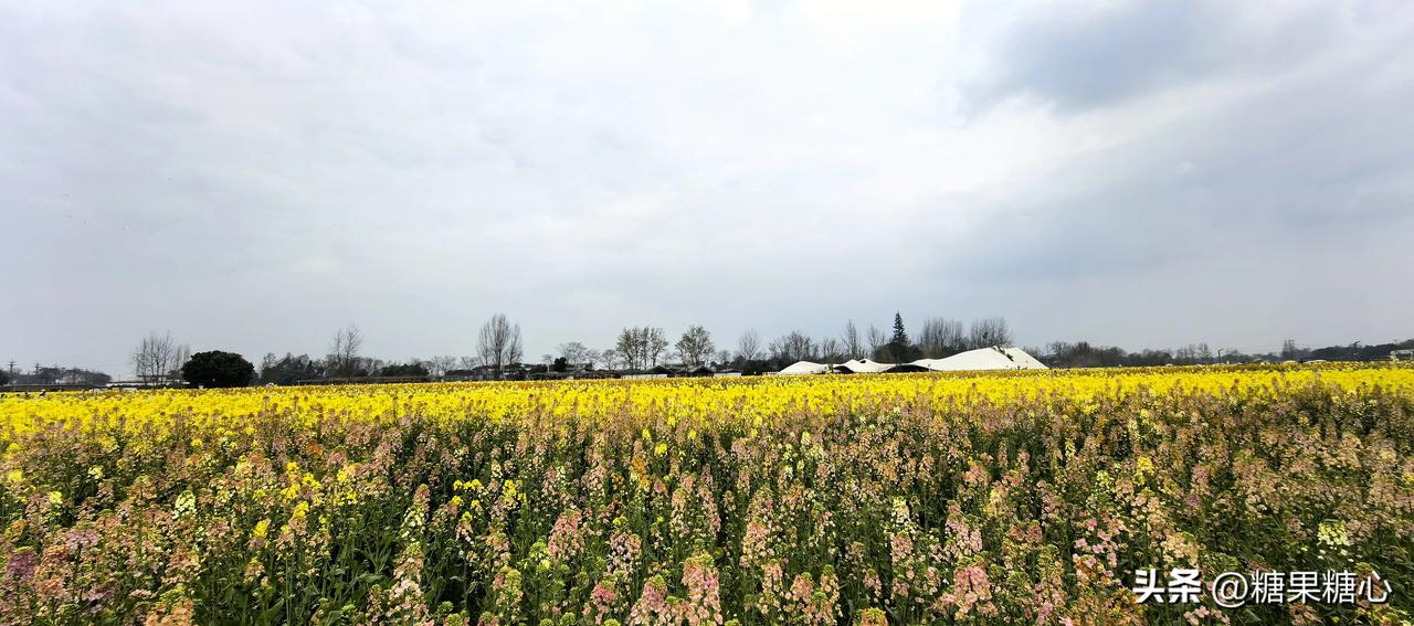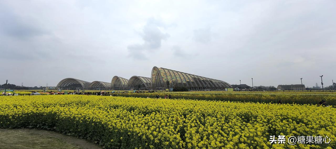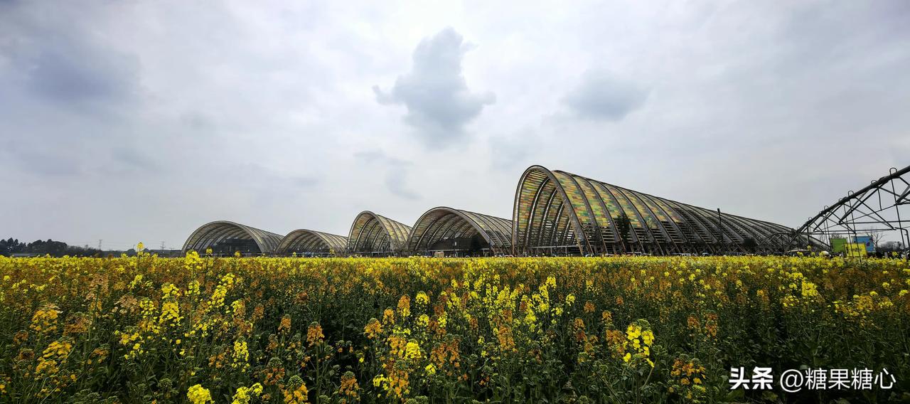 新津农博园,春天里特别的浪漫。 五颜六色盛开的油菜花到处妆点。 偶遇拿着奶茶的李