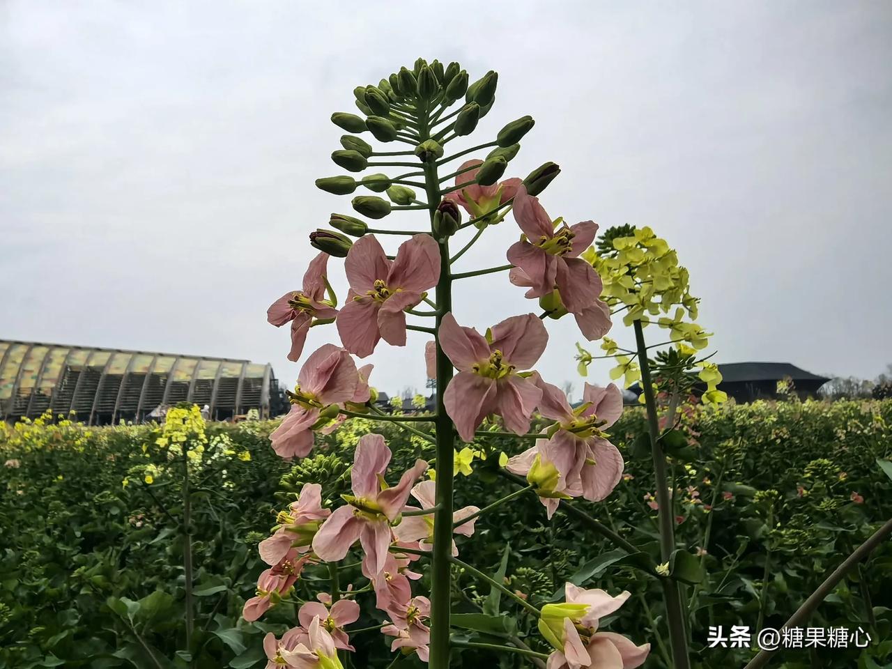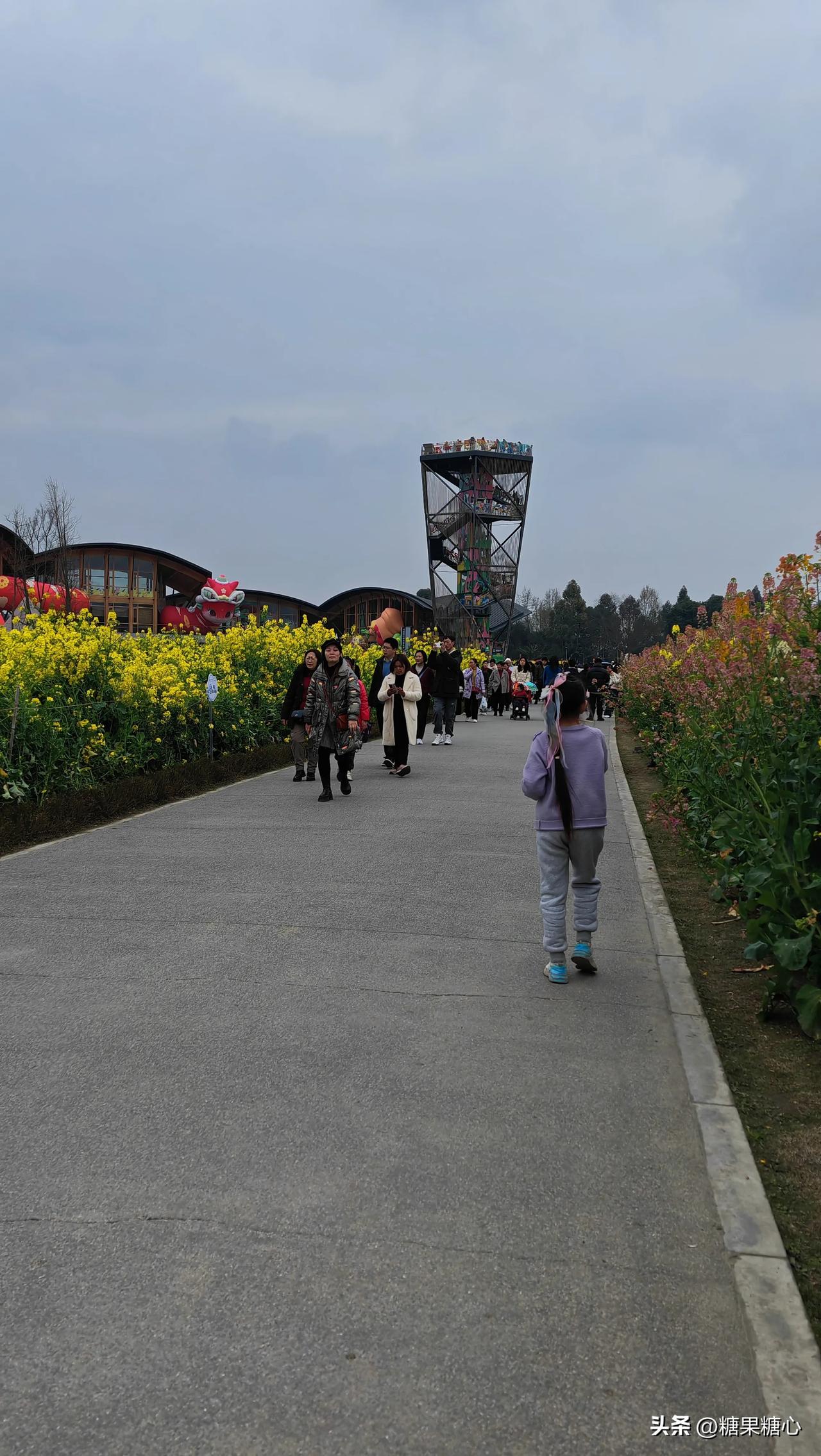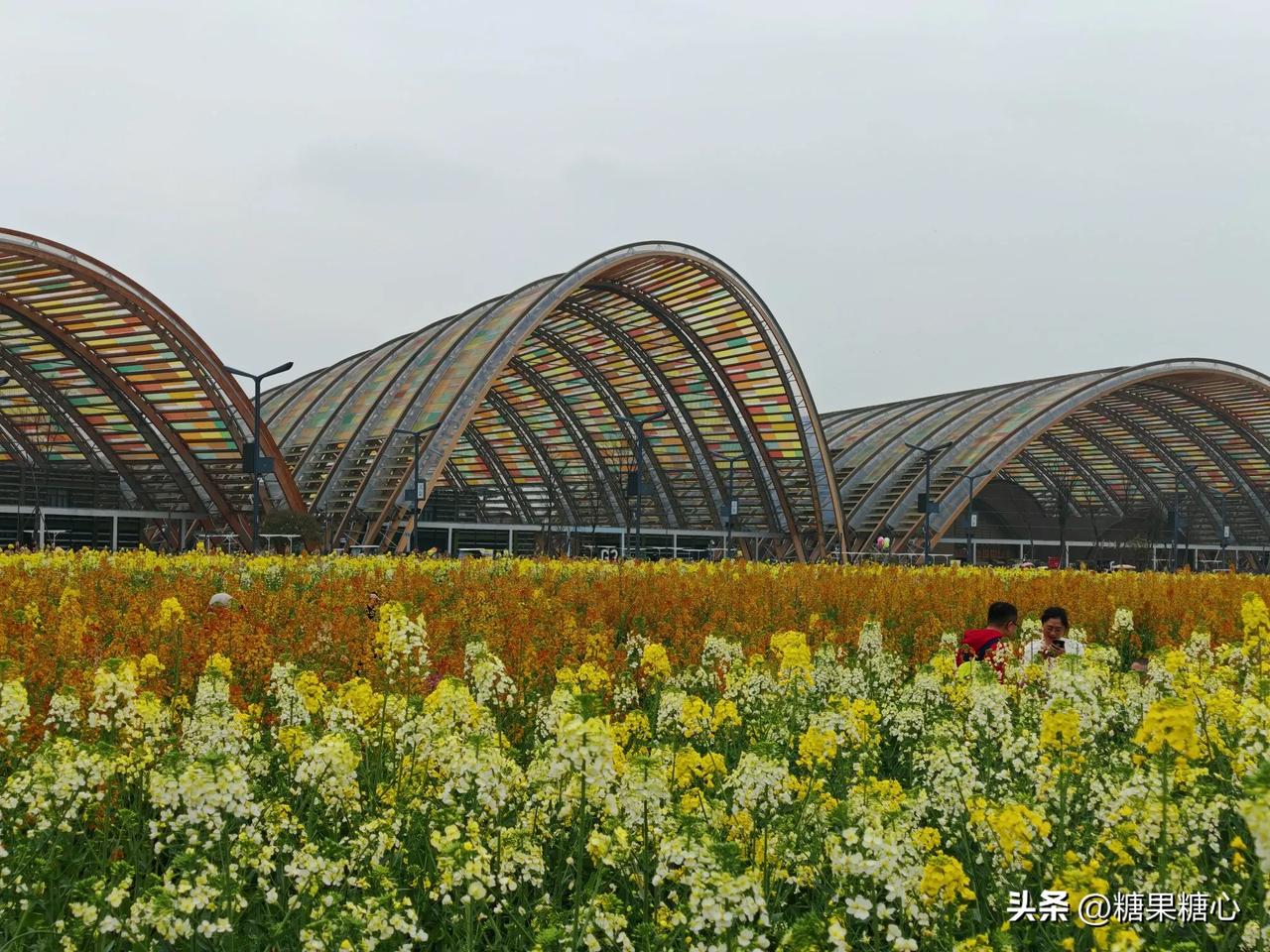 新津农博园,春天里特别的浪漫。 五颜六色盛开的油菜花到处妆点。 偶遇拿着奶茶的李