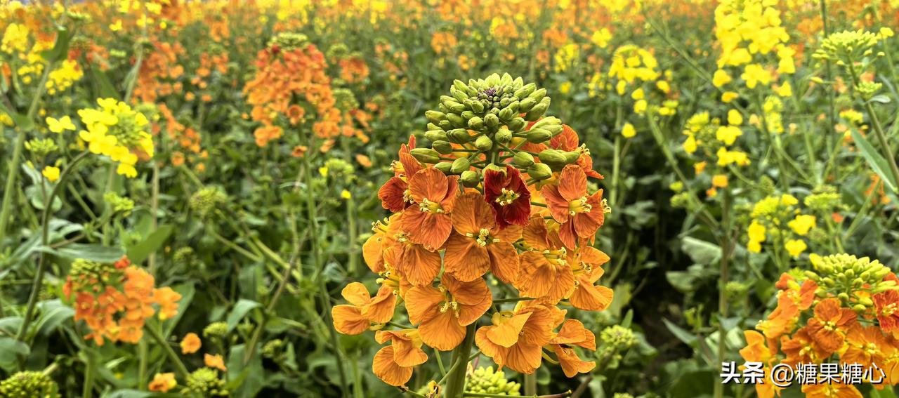 五颜六色盛开的油菜花到处妆点。