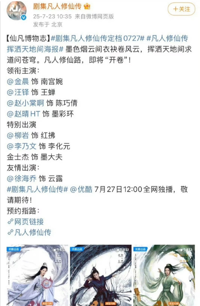 内娱又创造了一个奇葩的官宣方式,领衔主演杨洋和特别出演,友情出演官宣一次,另一篇官宣文案是领衔主演金晨,汪铎,赵小棠和赵晴以及特别出演,友情出演再官宣一次,这真是平台大制作,看看花这么多钱,能不能捧红一两个配角吧。