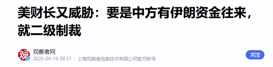 贝森特明确说,他们已经向有关方面提出要求,希望冻结更多伊朗革命卫队成员和伊朗领导层的资金。这个信号很危险。