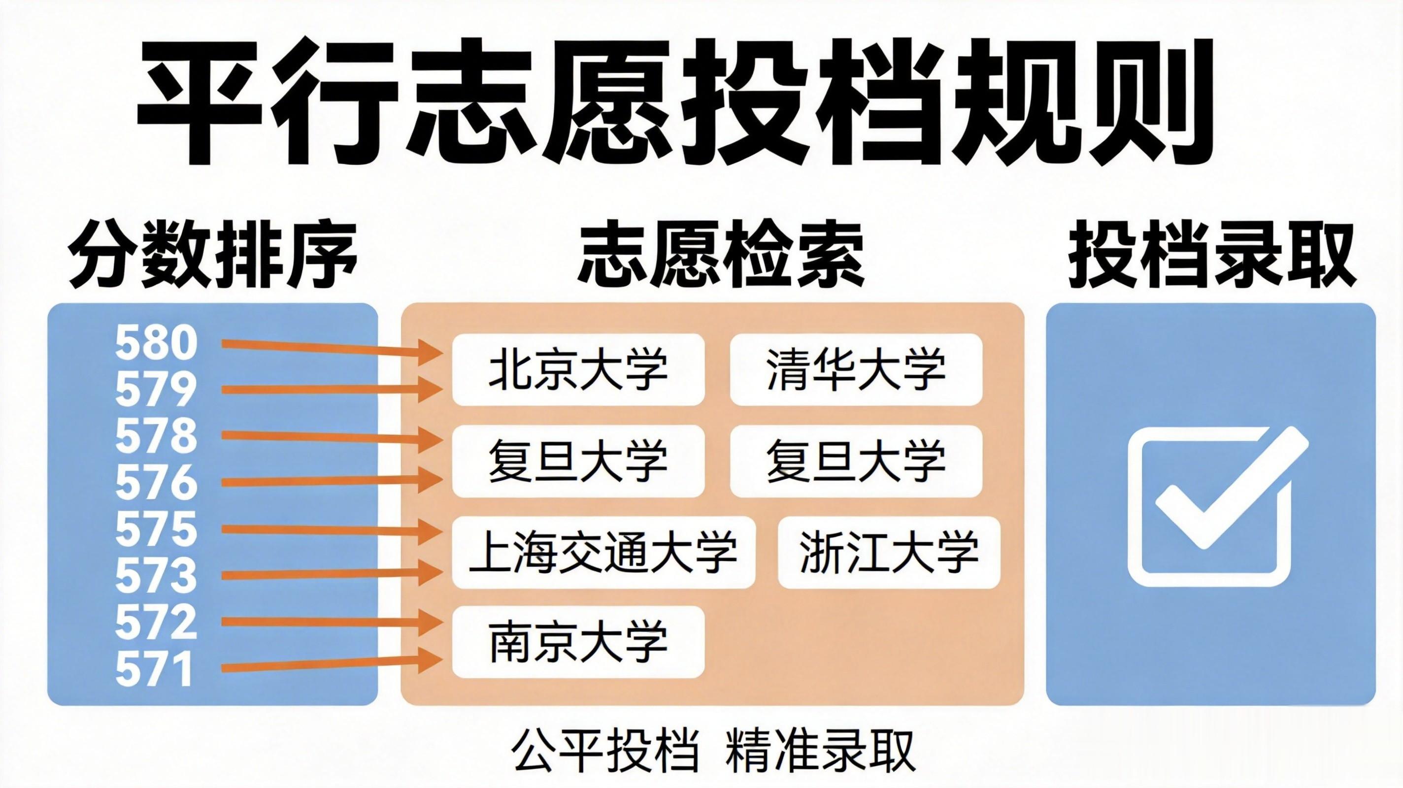 记住平行志愿的核心三句话:分数优先、遵循志愿、一轮投档。