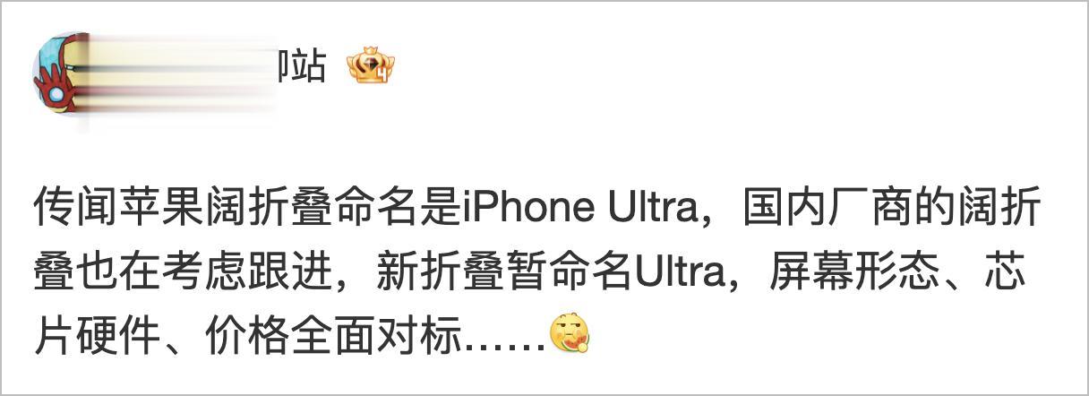 首先是产品的命名,根据国内博主@数码闲聊站的消息,苹果这款折叠屏 iPhone 并不会采用外界普遍称呼的「iPhone Fold」,而是有可能命名为 iPhone Ultra。