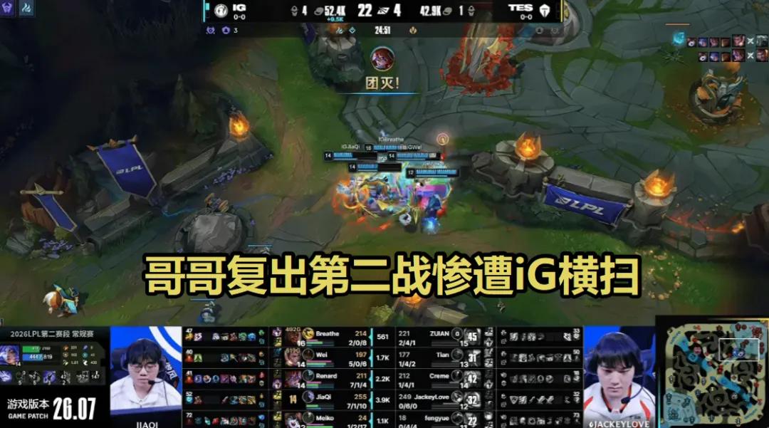 事情的起因是TES在第二赛段揭幕战中,对阵IG战队。而IG的AD选手Jiaqi,正是TES的前任AD。赛前大家都觉得JKL复出是“王者归来”,结果比赛一开打,画风完全不对。JKL对线被Jiaqi压着打,团战各种暴毙,整场BO3一个人头都没拿到,反而连续阵亡了12次。加上之前对阵AL时0-10的战绩,JKL复出后的总数据已经来到了惊人的0杀22死。有网友直接开喷:“这是世界冠军?这是退役选手吧!”