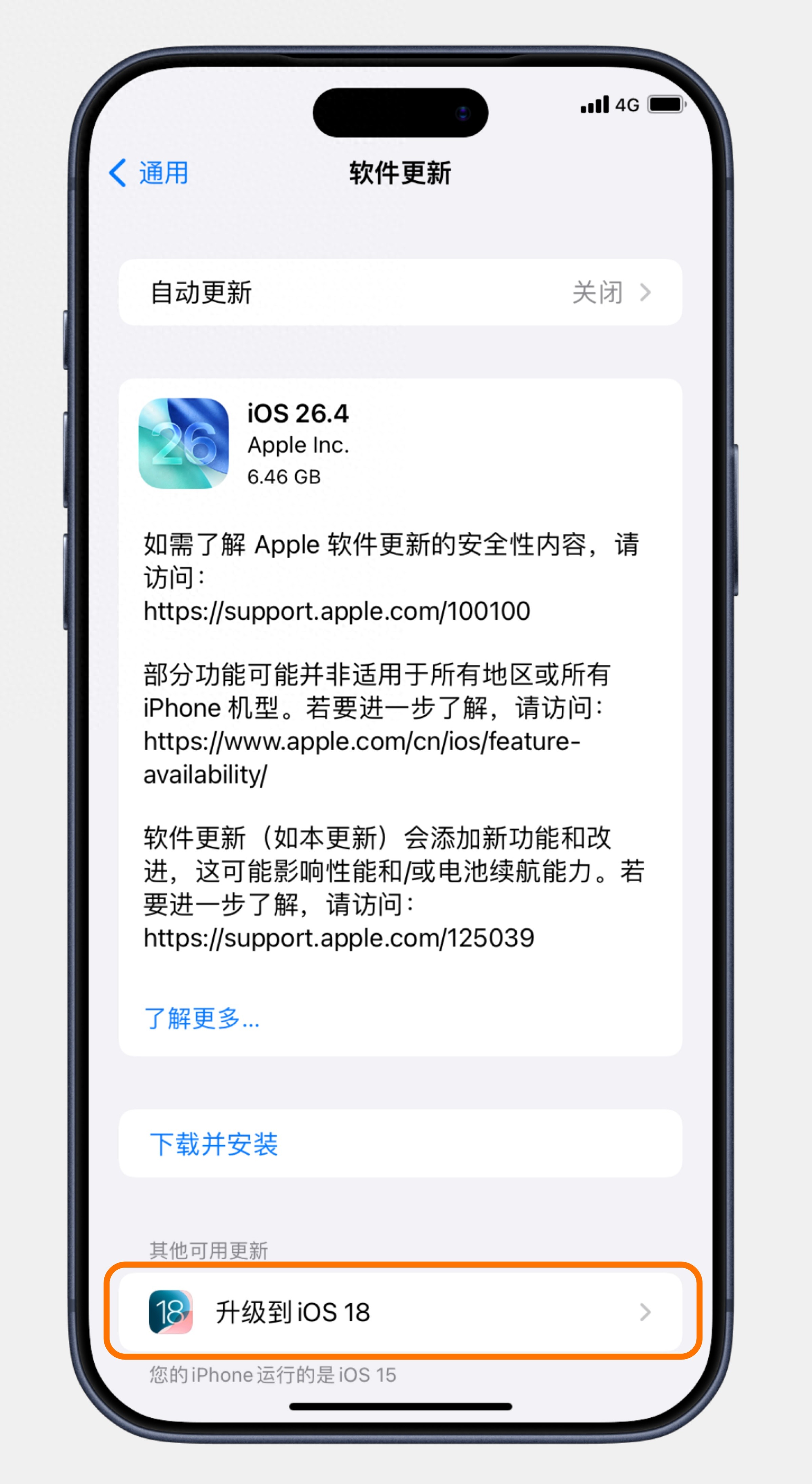比如你现在的iPhone还是iOS 15 系统,那么可选择升级至iOS 18.7.7 或者 iOS 26.4系统,而非此前只能升级至iOS 26 ;