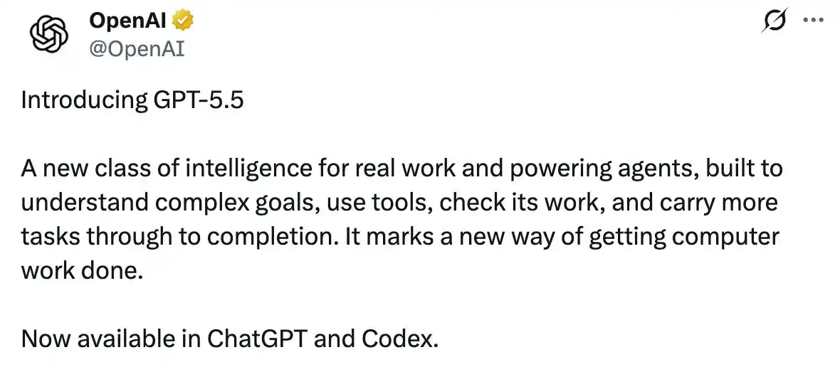 4月23 日 GPT-5.5 发布的同一天,Simon Willison(Django 框架共同创始人、AI 圈知名独立评测者)在自己的博客里写了一句审慎的话:“It's not a dramatic departure from what we've had before.”(这不是一次戏剧性的飞跃)。
