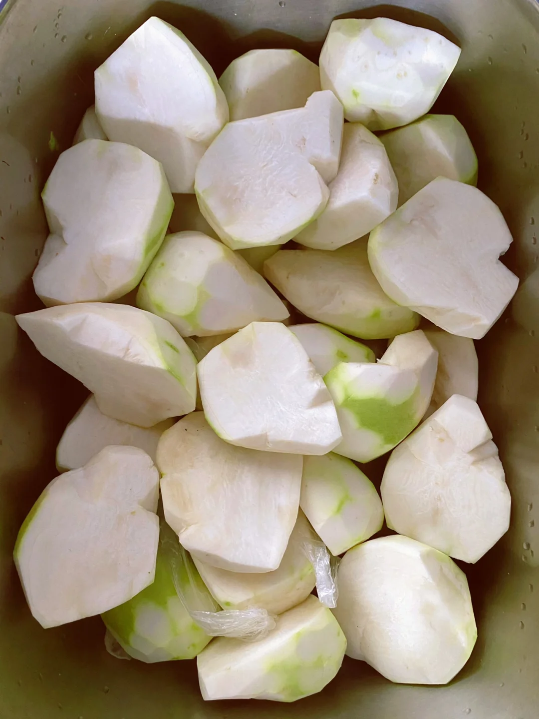 咱们这个芥菜疙瘩不用加水,等盐化了之后,芥菜疙瘩那个水分出来,自己就没过芥菜疙瘩了。