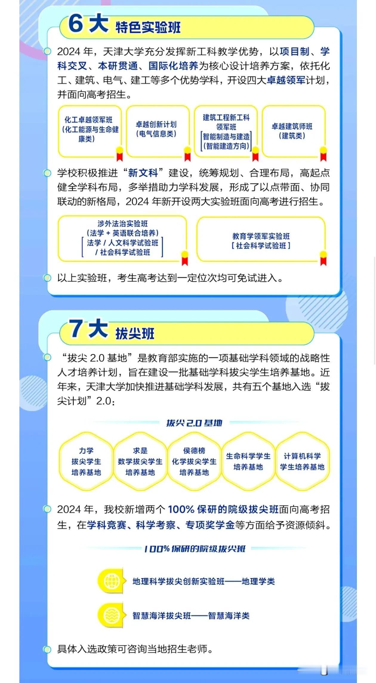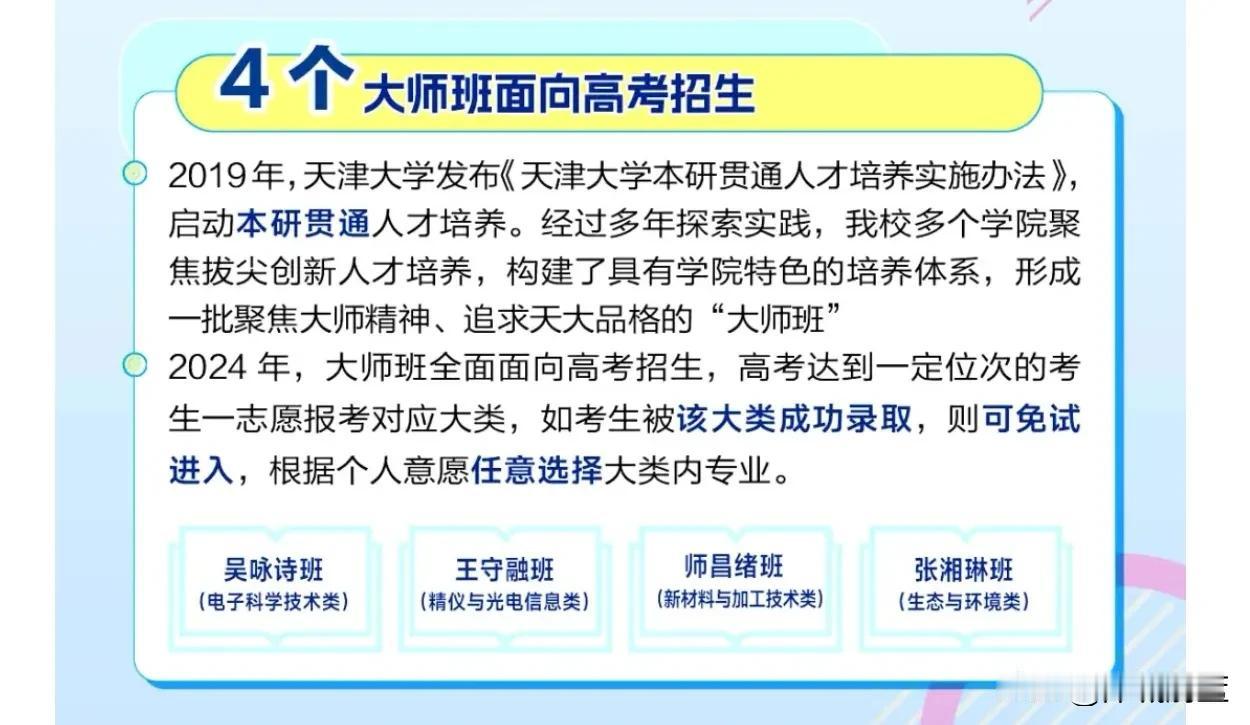 天津大学2024年招生亮点出炉,18个高保研率的未来技术、大师班、拔尖班、领军班今年都开始在高考阶段招生!8个大类开放了专业任选,针对不同分段有保一志愿、保N志愿、保不调剂!今年的考生有福气了[赞][赞][赞]