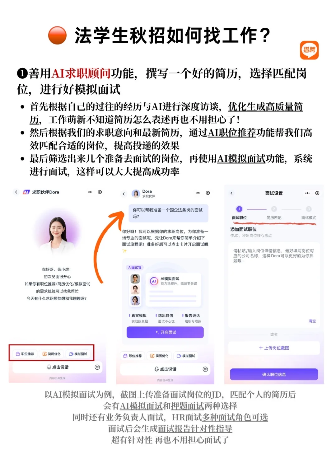 ①把系统的简历上传后,与AI深度访谈优化生成高质量简历,再依求职意向和简历匹配岗位;最后用AI模拟面试,上传岗位JD并匹配简历后,可选择AI模拟或押题面试,能选多种面试角色,面试成功率upup!