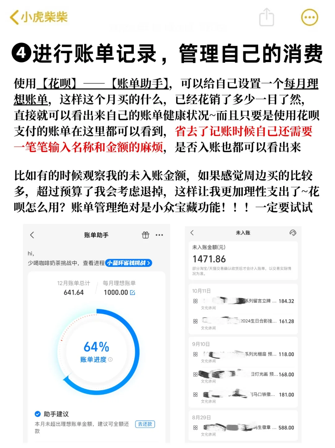 使用【花呗】——【账单助手】,可以给自己设置一个每月理想账单,这样这个月买的什么,已经花销了多少一目了然,直接就能看出来自己的账单是否理想~而且只要是使用花呗支付的账单都可以看到,省去了记账时还需要一笔笔输入名称和金额的麻烦,是否入账也都可以看出来
