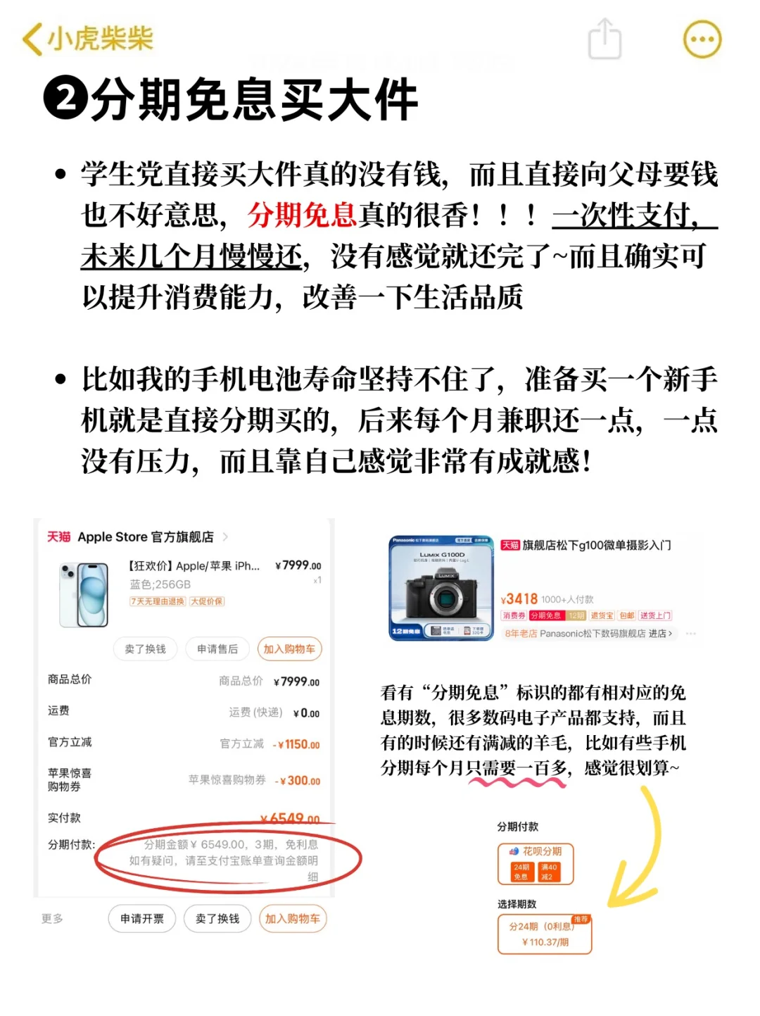 学生党直接买刚需大件有时候压力挺大的,直接向父母要钱我现在也不好意思,分期免息真的很香!!!完全没利息,未来几个月慢慢还,没有感觉就还完了~而且还可以改善一下生活品质,比如我的手机用了快6年,电池老是充不进电。直接分期免息买的新的,每个月兼职还一点压力也不大~感觉非常有成就感