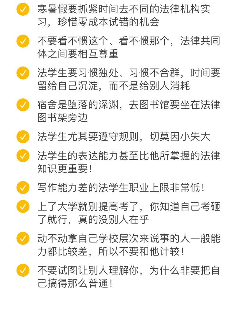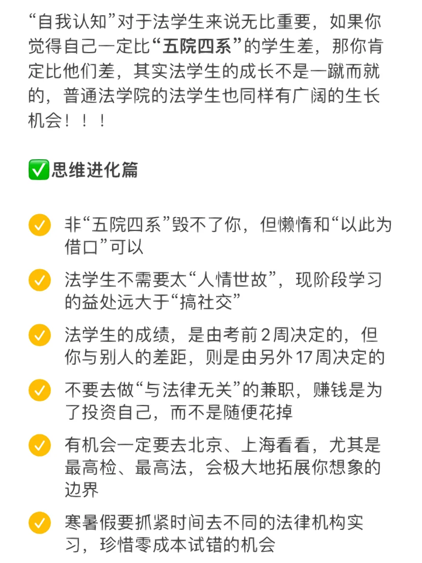 🎉🎉🎉“自我认知”对于法学生来说无比重要,如果你觉得自己一定比“五院四系”的学生差,那你肯定比他们差,其实法学生的成长不是一蹴而就的,普通法学院的法学生也同样有广阔的生长机会!!!2023年大年30发这个帖子就是想告诉所有的法学生,我们的未来还有无限可能!让我们一起悄悄努力,用一年时间改变自己,彻底惊艳所有人!
