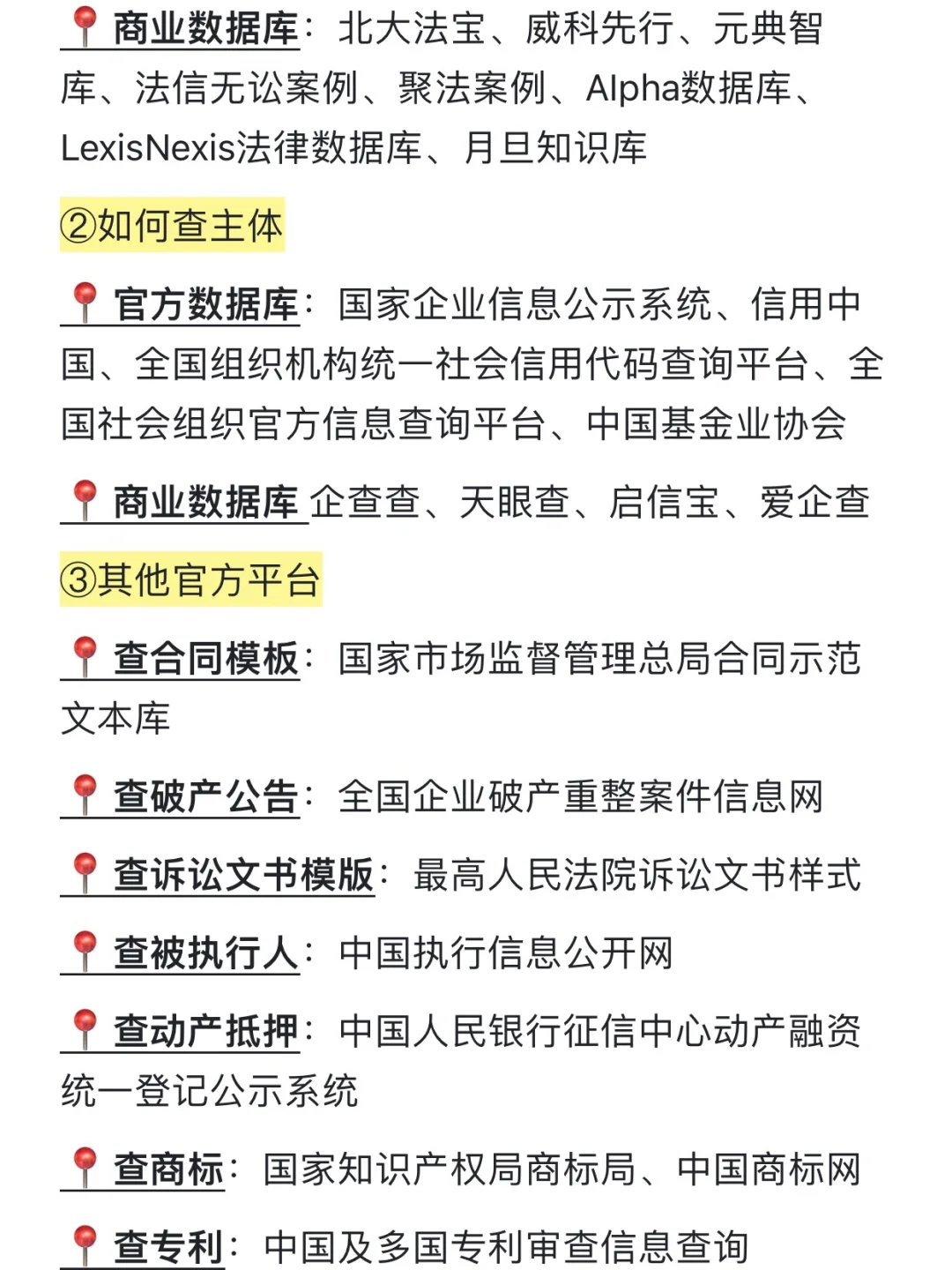 📍官方数据库:中国裁判文书网、国家法律法规数据库、人民法院案例库、最高人民法院公报、最高人民检察院公报、行政处罚文书网、最高人民法院数字图书馆、中国司法大数据服务网、全国企业破产重整案件信息网