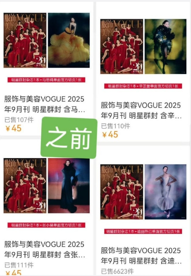 给每一位明星单独开了链接销售,结果迪丽热巴断层第一,也只卖了几千本,除了她和刘亦菲之外,其他人卖了几十到几百本,销售额确实难看,尤其是11个人放在一块对比非常尴尬,结果今天VOGUE就把销售数量给隐藏了,估计又被连夜公关了,11个女人在一起,总有几个事多的。