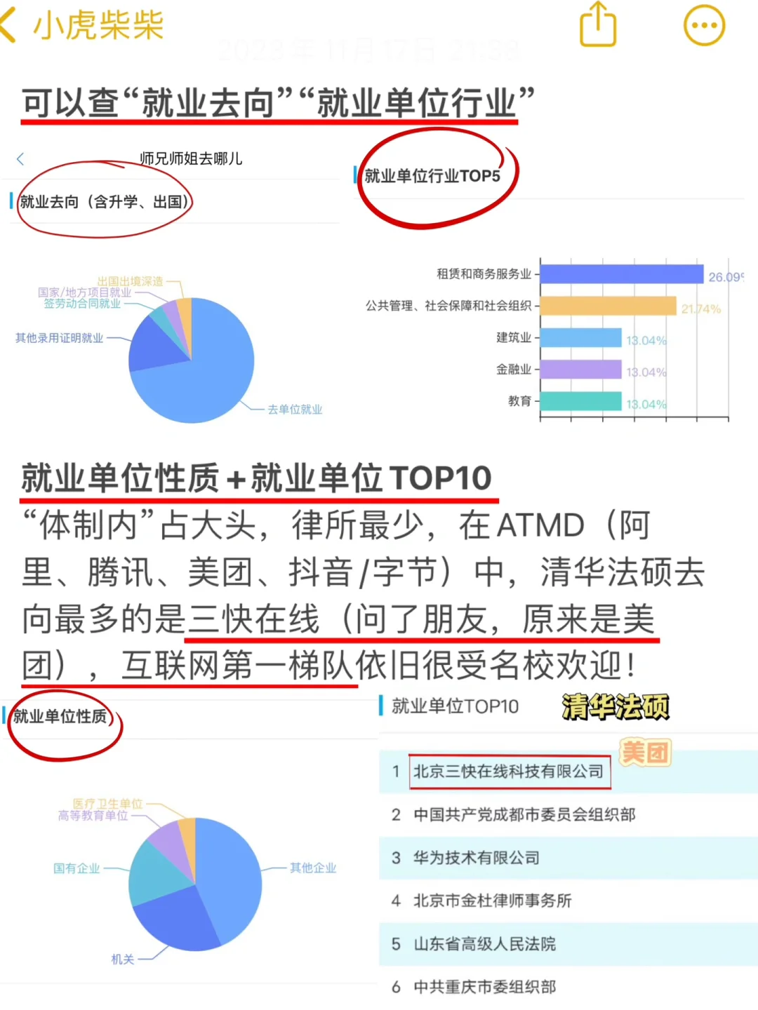★据查询结果,法学生“体制内”占大头,律所最少,部分突出的去了ATMD(阿里、腾讯、美团、/字节)法务,以清华法硕为例,去向最多的是三快在线(就是美团),互联网第一梯队依旧很受名校欢迎!