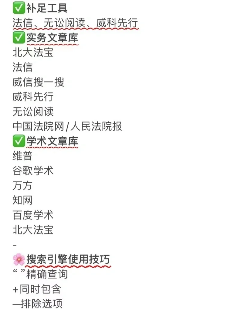 📍官方数据库:中国裁判文书网、国家法律法规数据库、人民法院案例库、最高人民法院公报、最高人民检察院公报、行政处罚文书网、最高人民法院数字图书馆、中国司法大数据服务网、全国企业破产重整案件信息网