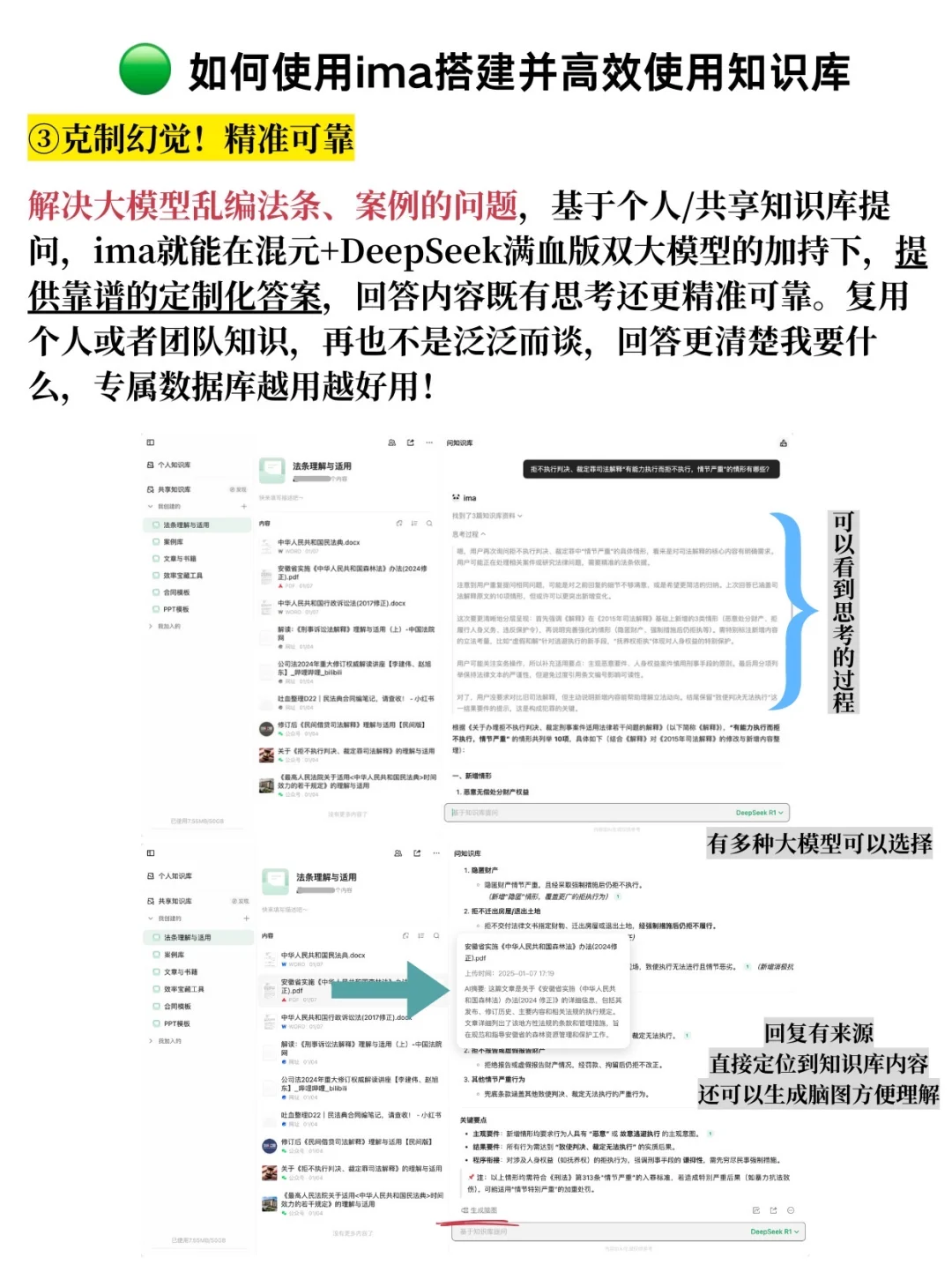 解决大模型乱编法条、案例的问题,基于个人/团队/共享知识库提问,ima能在混元+DeepSeek满血版双大模型的加持下,提供靠谱的定制化答案,回答内容既有思考还精准可靠。复用个人或者团队知识,再也不是泛泛而谈,回答更清楚我要什么,专属数据库越用越好用