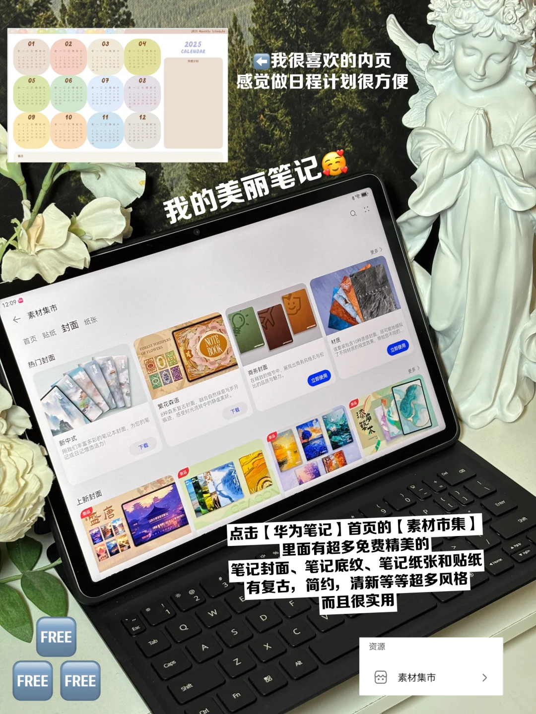 ③点击「素材市集」里有超多免费精美的笔记封面、底纹、纸张、贴纸,已经完全爱上做笔记了!不仅实用而且像件“艺术品”