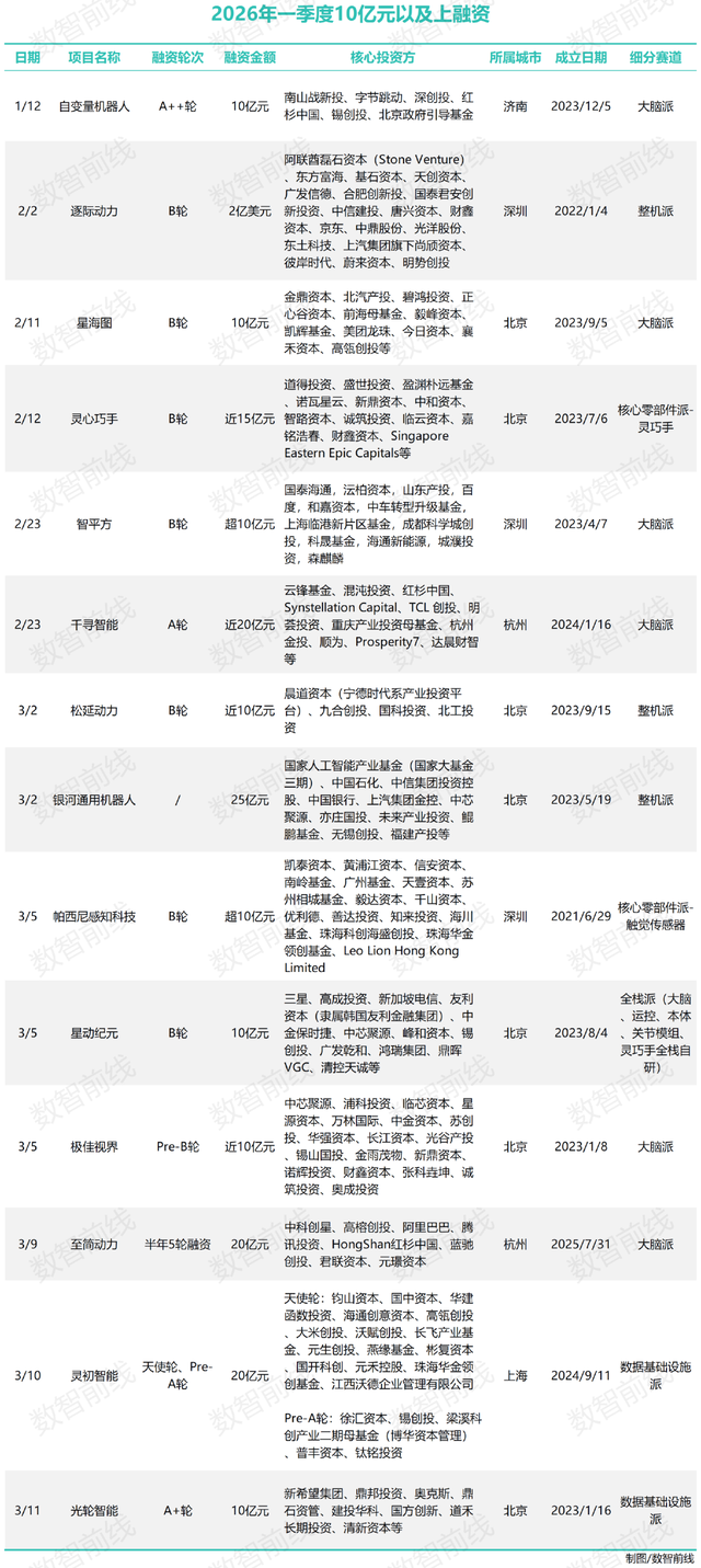 单笔融资量级也在持续走高。据数智前线不完全统计,2026年第一季度,具身智能领域已经出现14起单笔金额10亿元及以上的融资。对比之下,2025年全年共6起融资达到这一量级,2024年全年,仅宇树科技1起。