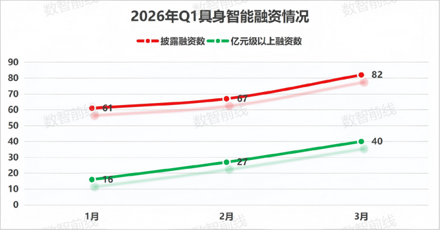 据数智前线从天眼查、企查查等渠道不完全统计,2026年Q1,具身智能领域披露的融资事件已至少有210起,涉及大脑算法、小脑控制、机器人本体、灵巧手、训练数据、垂直落地场景等全产业链细分赛道的193家企业。且每个月披露的融资笔数都在60笔以上,平均每天至少2起以上融资。