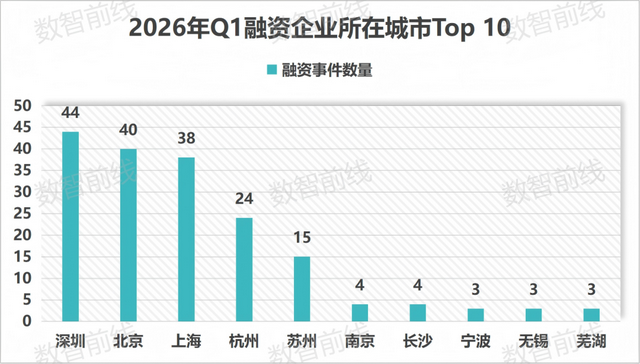 值得一提的是,依托既有具身智能产业基础,叠加国资加速下场推动,一季度210起融资中被投企业已覆盖全国32个城市,其中深圳(44起)、北京(40起)、上海(38起)居前三,杭州(24起)、苏州(15起)位列第二梯队。
