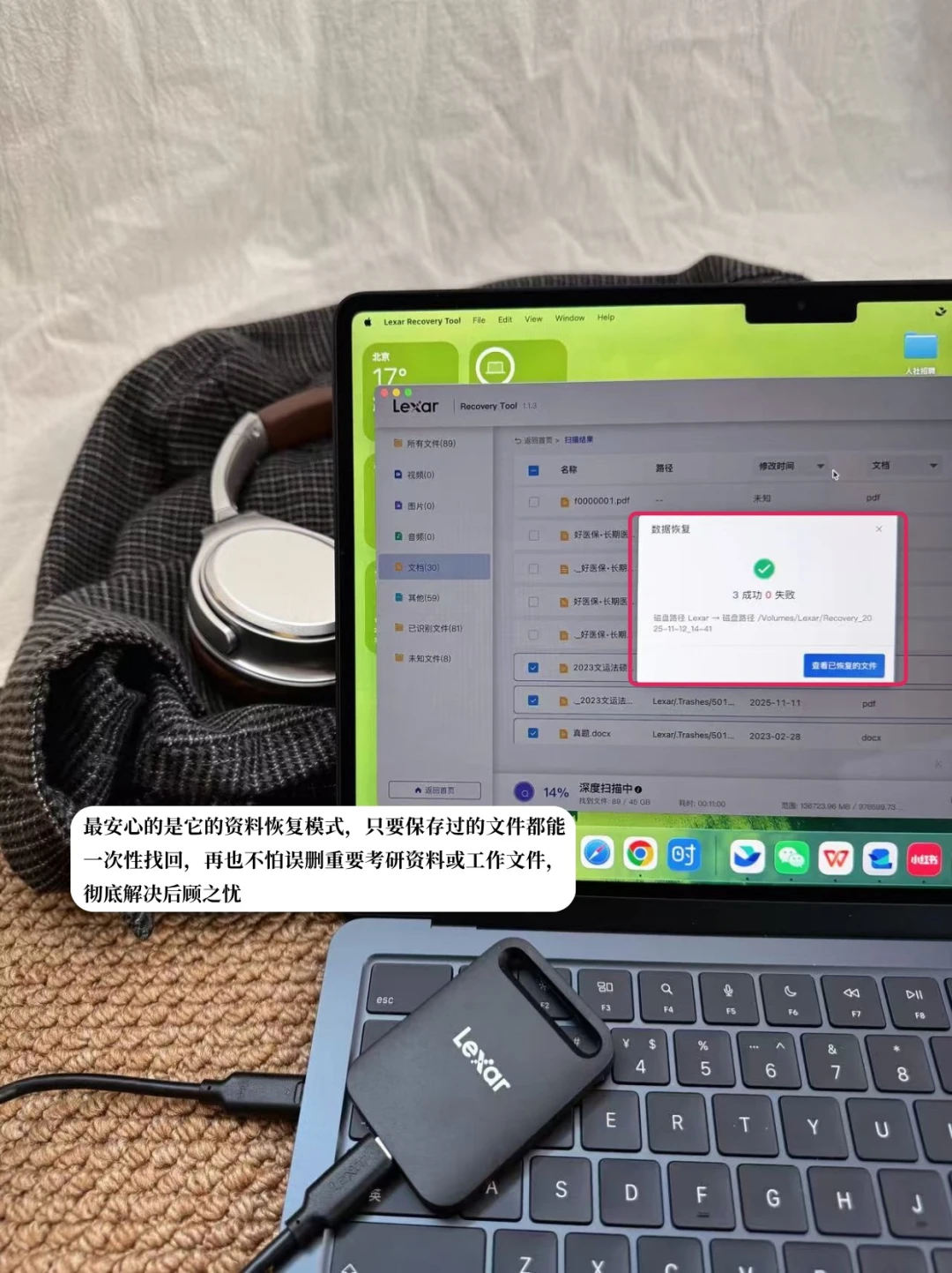考研、法考资料多、网课占空间,低配设备内存告急?雷克沙 Air 小轻块移动硬盘完美适配:1TB 大容量轻松收纳网课、电子真题,1G 文件几秒传输,整理笔记、导网课高效省时;手机 / 平板 / 电脑全兼容,一键扩容随取随用;19g 重、卡片大小,外出学习揣兜无负担;资料恢复模式可找回保存文件,不怕误删重要资料