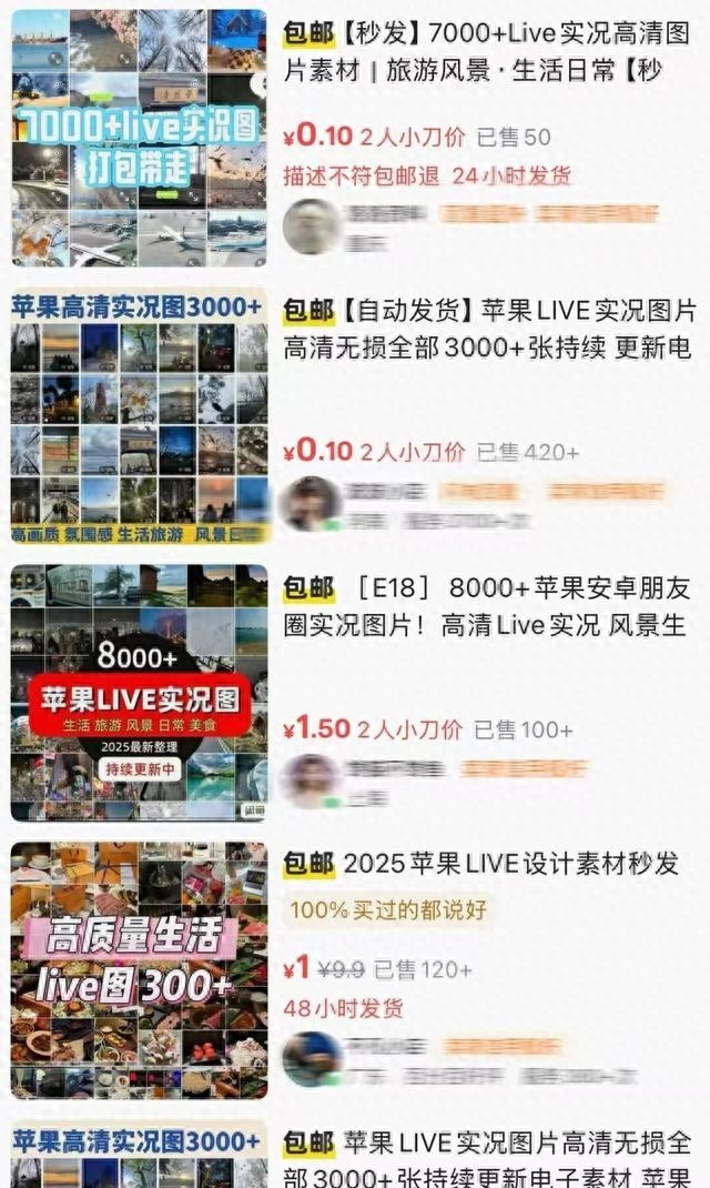 几块钱你能买到什么?上千张带有live实况效果的网盘素材包。不管你想要欧洲古堡的黄昏,还是米其林餐厅的刀叉,哪怕是高尔夫球场挥杆的瞬间,这里应有尽有。商家连文案和发布时间都给你规划好了,可谓是“保姆级”服务。