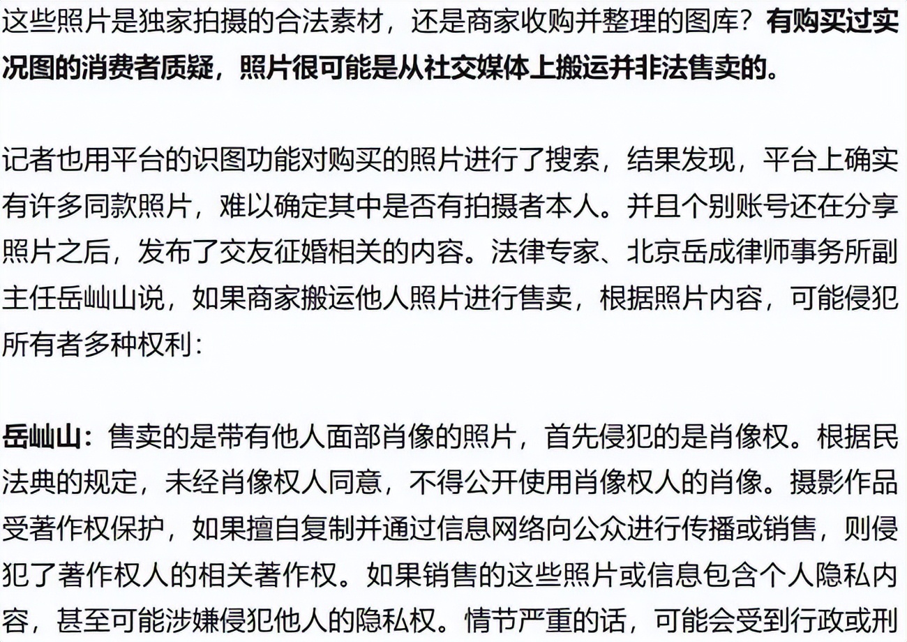北京岳成律师事务所副主任岳屾山也发出了严重警告。这种随意搬运别人照片售卖的行为,直接侵犯了原作者的肖像权、著作权,甚至隐私权。 已经有消费者买了几块钱的图包发在朋友圈,结果图片上还带着原作者的水印,直接面临社死。如果将这些假人设用于诈骗,更将面临刑事处罚的雷霆之威。