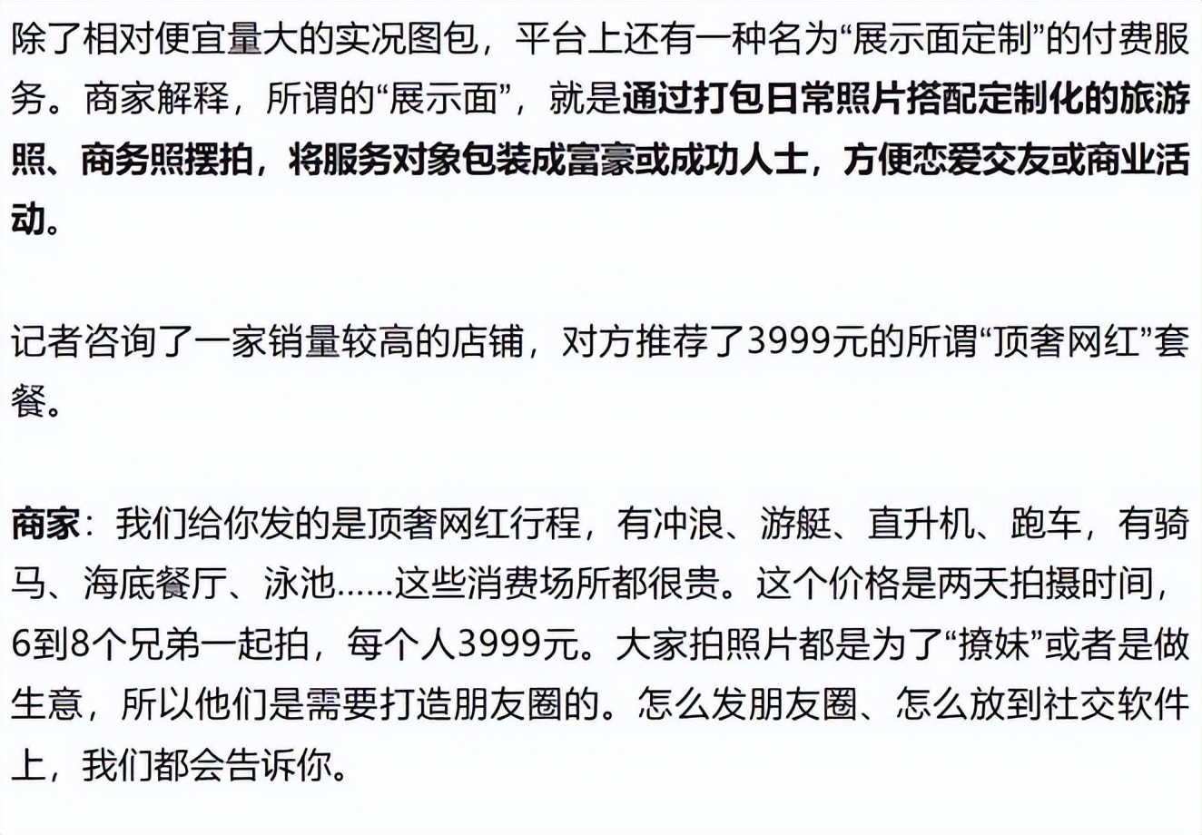 这场面,堪称现代版的“荒诞派戏剧”。 商家把话挑得很明:“大家拍照片都是为了‘撩妹’或者是做生意,所以需要打造朋友圈。怎么发、怎么配文,我们全包。”