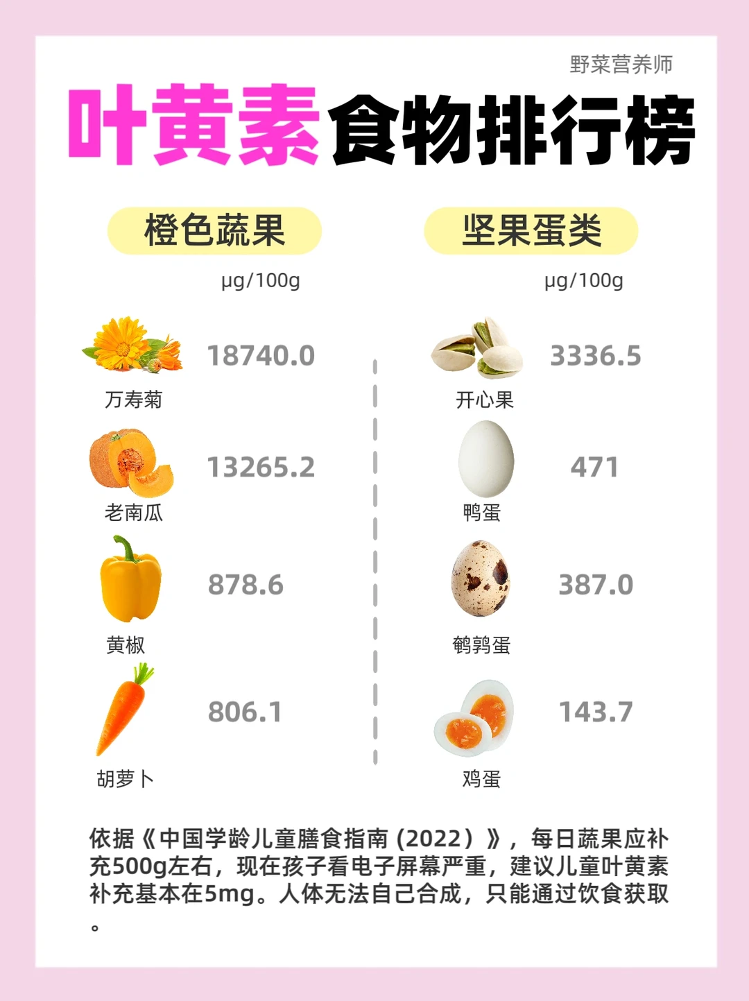 🔺 依据《学龄儿童腾食指南(2022)》,每旦蔬果应补充500g左右,现在孩子看电子屏幕严重,建议儿童叶黄素补充基本在5mg。人体无法自己合成,只能通过饮食获取。