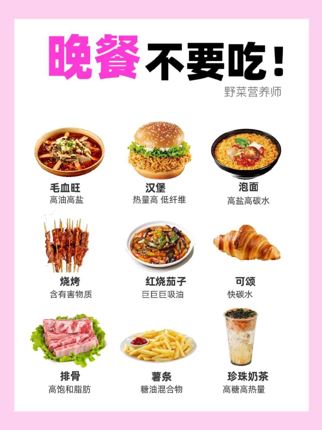 高油高碳水高糖的食物尽量别碰哦!晚餐吃少油少盐清淡的食物,别给身体增加负担,按照这个攻略吃,月瘦10j很轻松[暗中观察R][暗中观察R][暗中观察R]