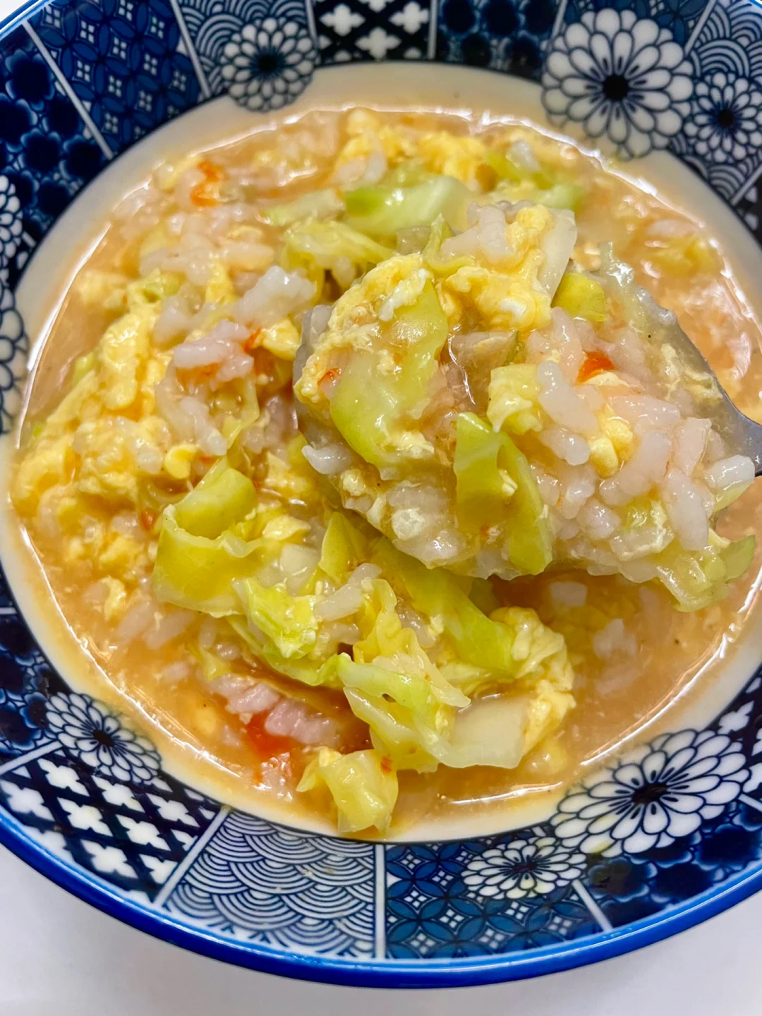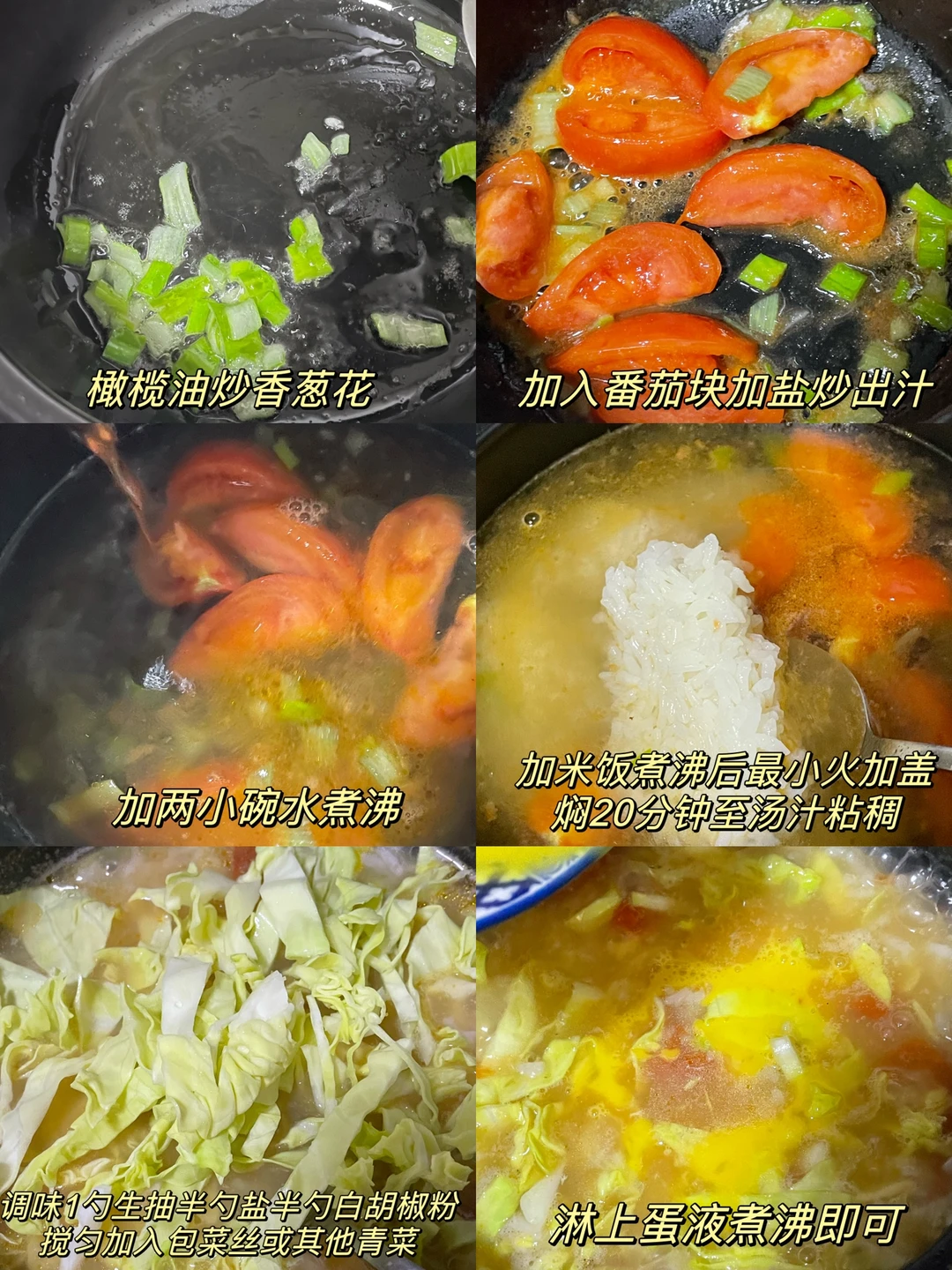 番茄一颗 包菜或青菜几片 鸡蛋一颗 剩米饭少量