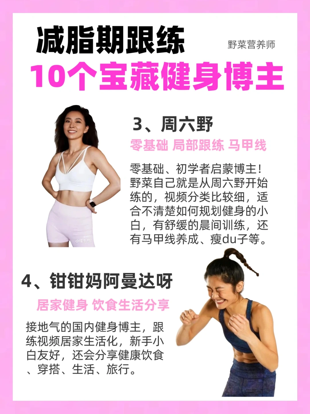 零基础、初学者启蒙博主!野菜自己就是从周六野开始练的,视频分类比较细,适合不清楚如何规划健身的小白,有舒缓的晨间训练,还有马甲线养成、瘦du子等。