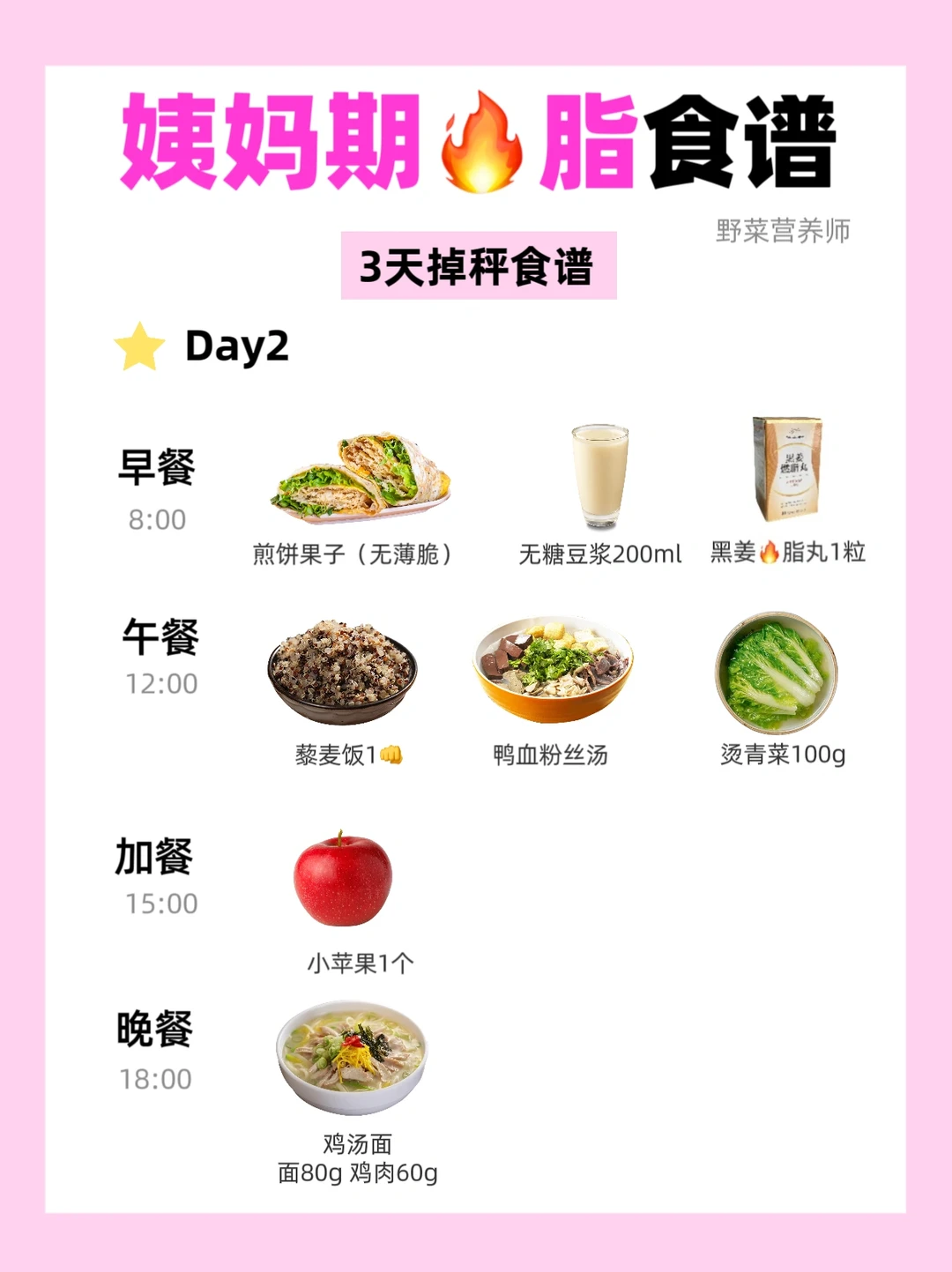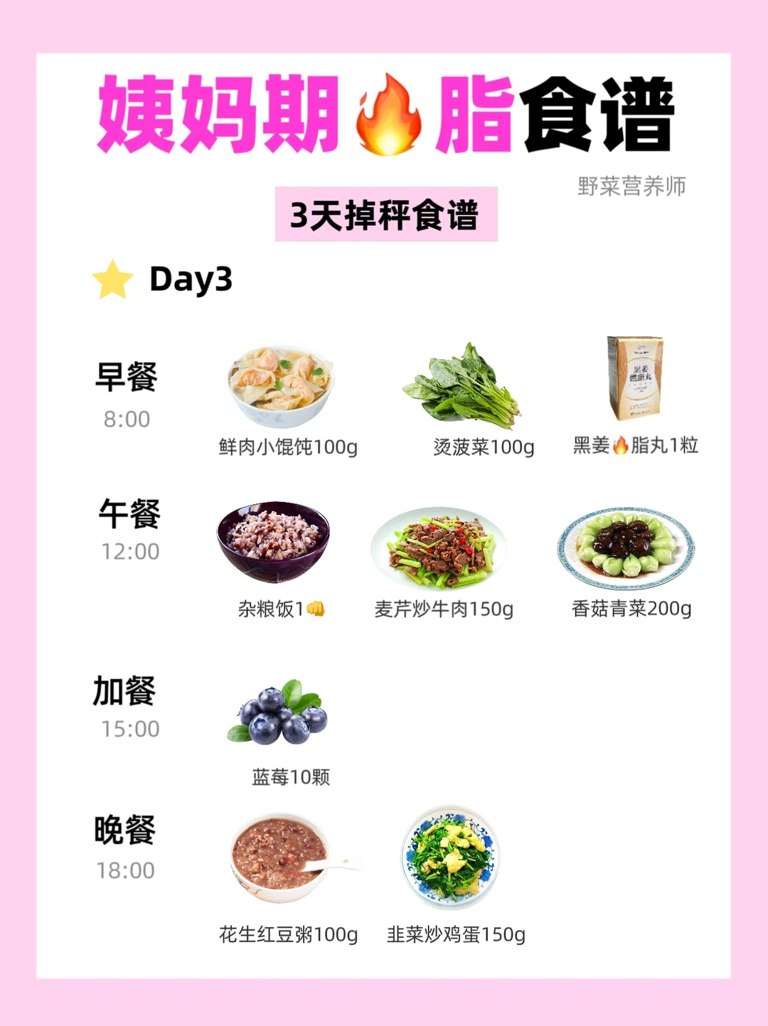 野菜营养师给各位姐妹分享了姨妈期不饿肚子也能瘦的3天食谱🔥姨妈期的食谱主要遵循避免寒凉食物、增加🥚白质、动物🩸、猪肝等含铁和维生素C的食物摄入,碳水摄入量不能太少。