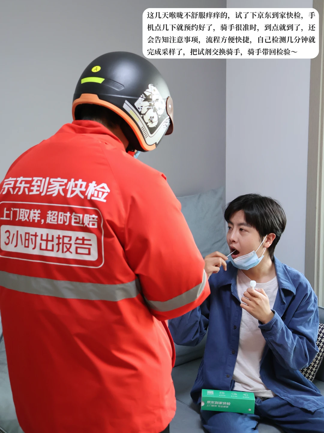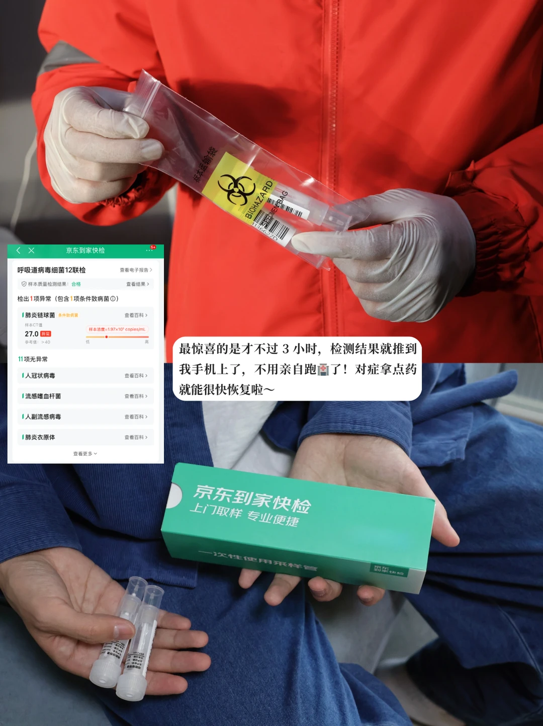 ✔最后试了下京东到家快检,为了安心,选了呼吸道病毒细菌12联检的自采样,手机点几下就预约好了。预约安排在午休前半小时,骑手到点就到了,还会告知注意事项,流程方便快捷,自己检测几分钟就完成采样了,再把试剂交给骑手带回检验,连喝口水的功夫都没耽误,完全没影响下午的工作!
