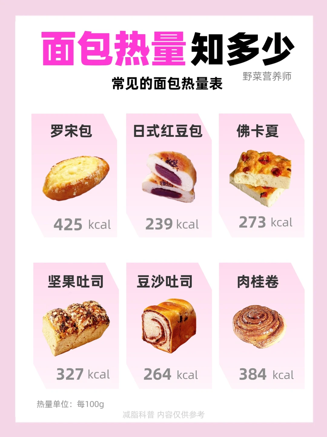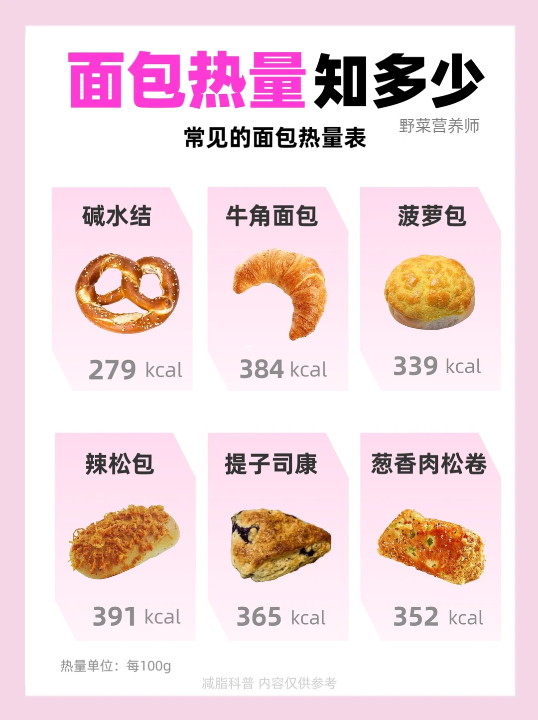 吃不对的面包简直就是增胖的罪魁祸首,糖、油、奶这几种材料热量非常高。全麦面包或低油糖的热量在250千卡左右,因此✂️脂人士应该选择全麦面包,或者硬质面包作为主食,不要选择高🍬高油面包,例如菠萝包、可颂、牛角包、罗宋包等。